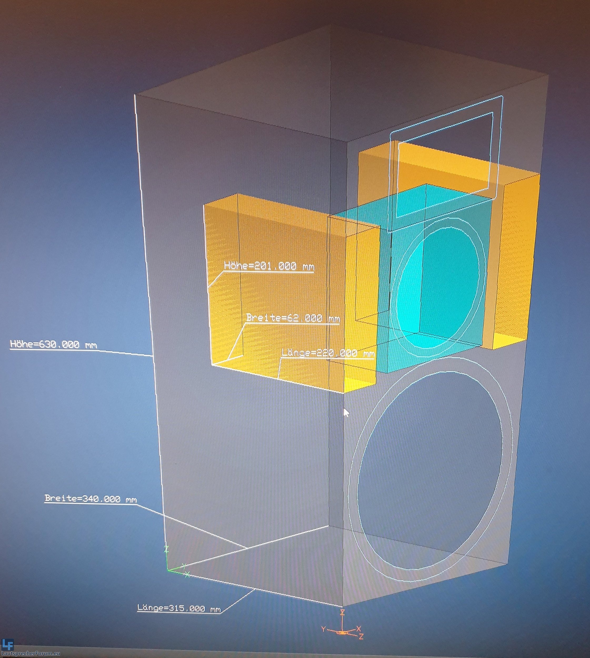 Das wäre der Entwurf. Hier komme ich abzüglich der ganzen Einbauten und Materialstärken auf 49,7L. Den TT habe ich mit 3L Volumen berechnet. Das passt denke ich grob. Die Maße sind wieder alles innenmaße.