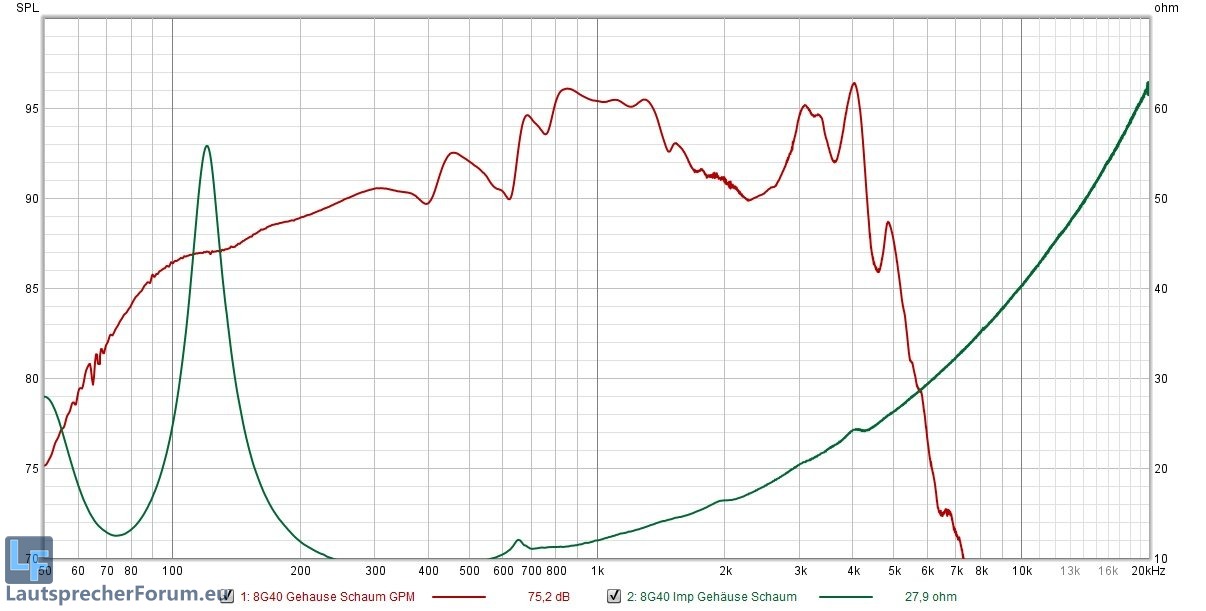 Simon hat geschrieben: 20. Apr 2022 23:14 Die Reso bleibt bestehen - egal wie viel Noppenschaum ich ins Gehäuse gestopft habe. Um das Chassis an sich auszuschließen, habe ich dieses "free Air" gemessen. Warum in Anführungszeichen? Der 8G40 lag hierbei auf Noppenschaum. Folglich nicht 100% free Air, aber nahe dran. Hier ist diese Reso nicht drin. Muss also vom Gehäuse kommen.