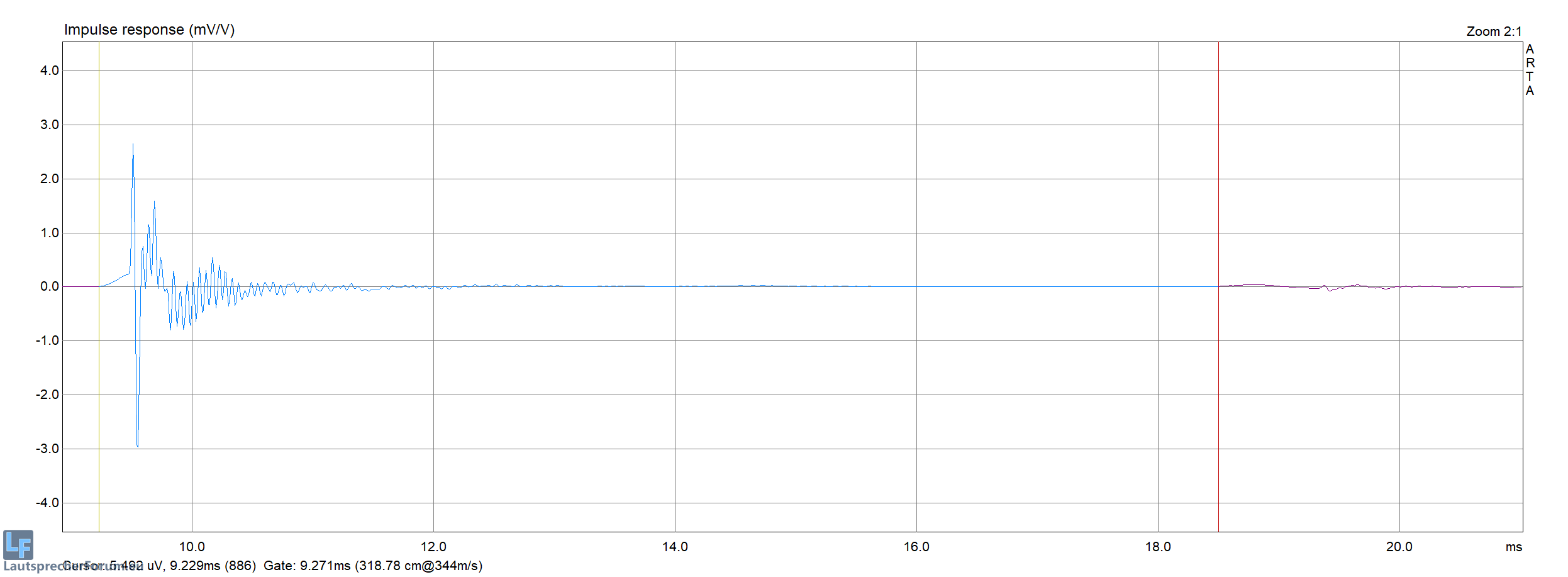 Jetzt habe ich nochmal gemessen, diesmal mit dem UCA202 direkt an der Endstufe. Das Mikro war auf 193 cm Höhe, der Abstand zum Lautsprecher 1,30 Meter. Damit habe ich eine Gatelänge von gut 8 ms ausgerechnet und 7,5 ms eingestellt. Hier das Messergebnis für die beiden Lautsprecher: