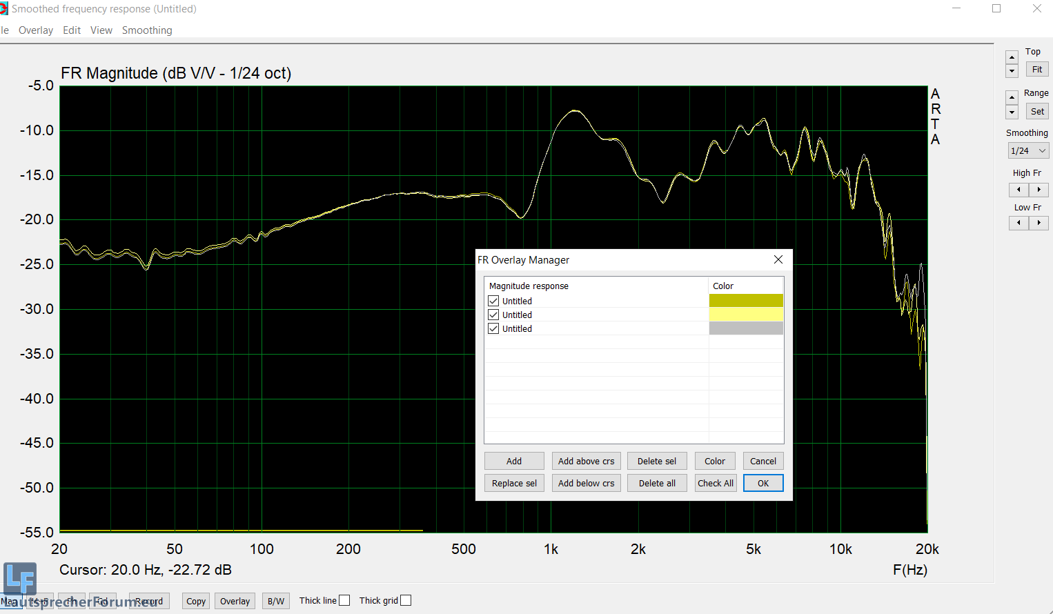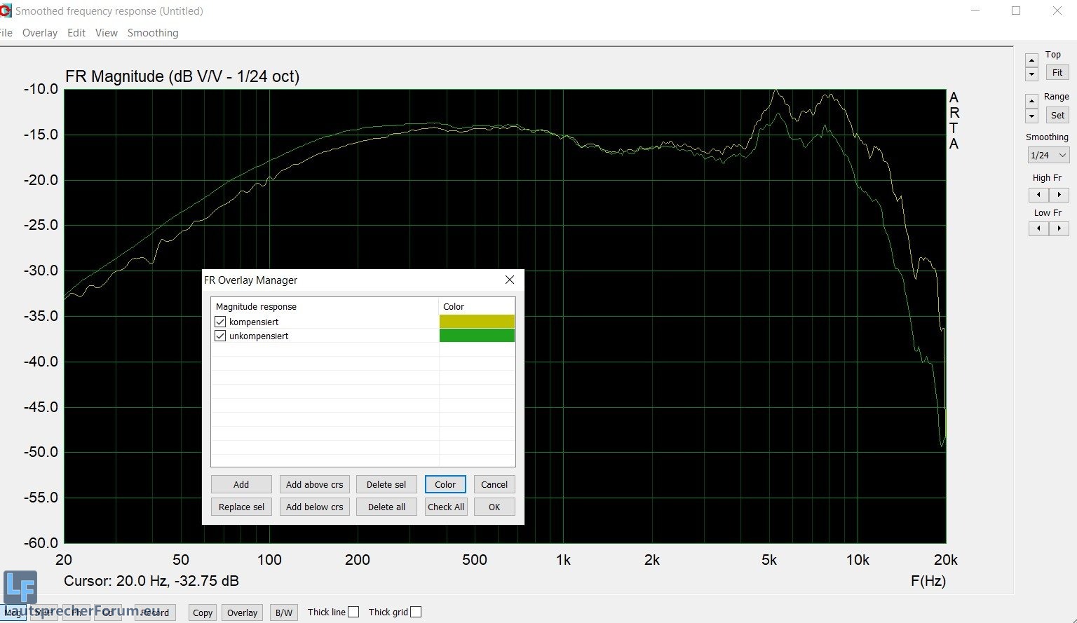 Falls du Interesse dran hast, mache mal das Gitter ab -> Messung. Dann nur den Hochtöner, dann nur den Tieftöner, dann den HF invertieren.