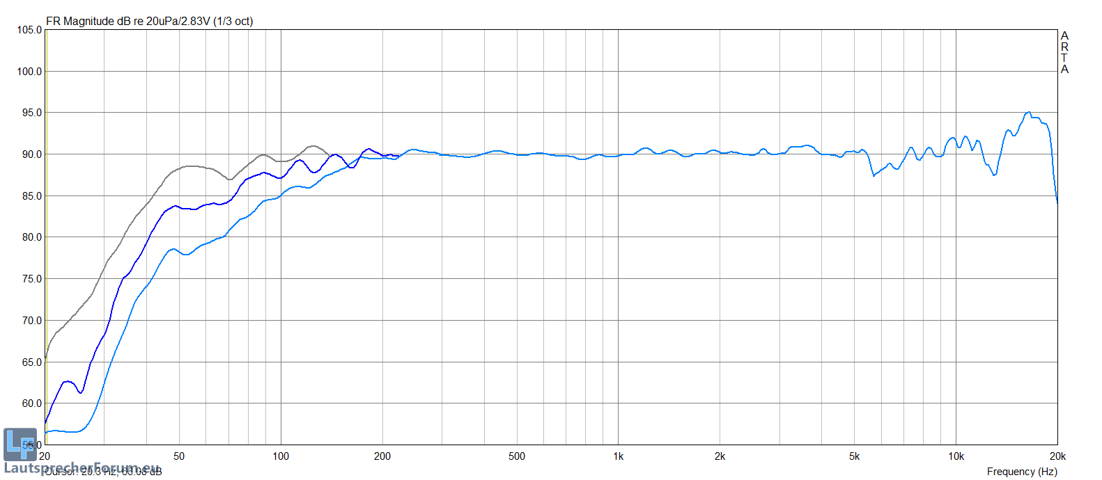 In den Bauvorschlägen aus der Hobby Hifi mit zwei TI100 sind es rund 88dB SPL auf 1m bei 2,83V. Pegelunterschiede kann ich aber mit der Aktivlösung problemlos ausgleichen. Wichtiger ist der maximal erreichbare Pegel bei Vollaussteuerung, da ich es ja mit Verstärkerkanälen mit unterschiedlicher Maximalleistung zu tun habe.