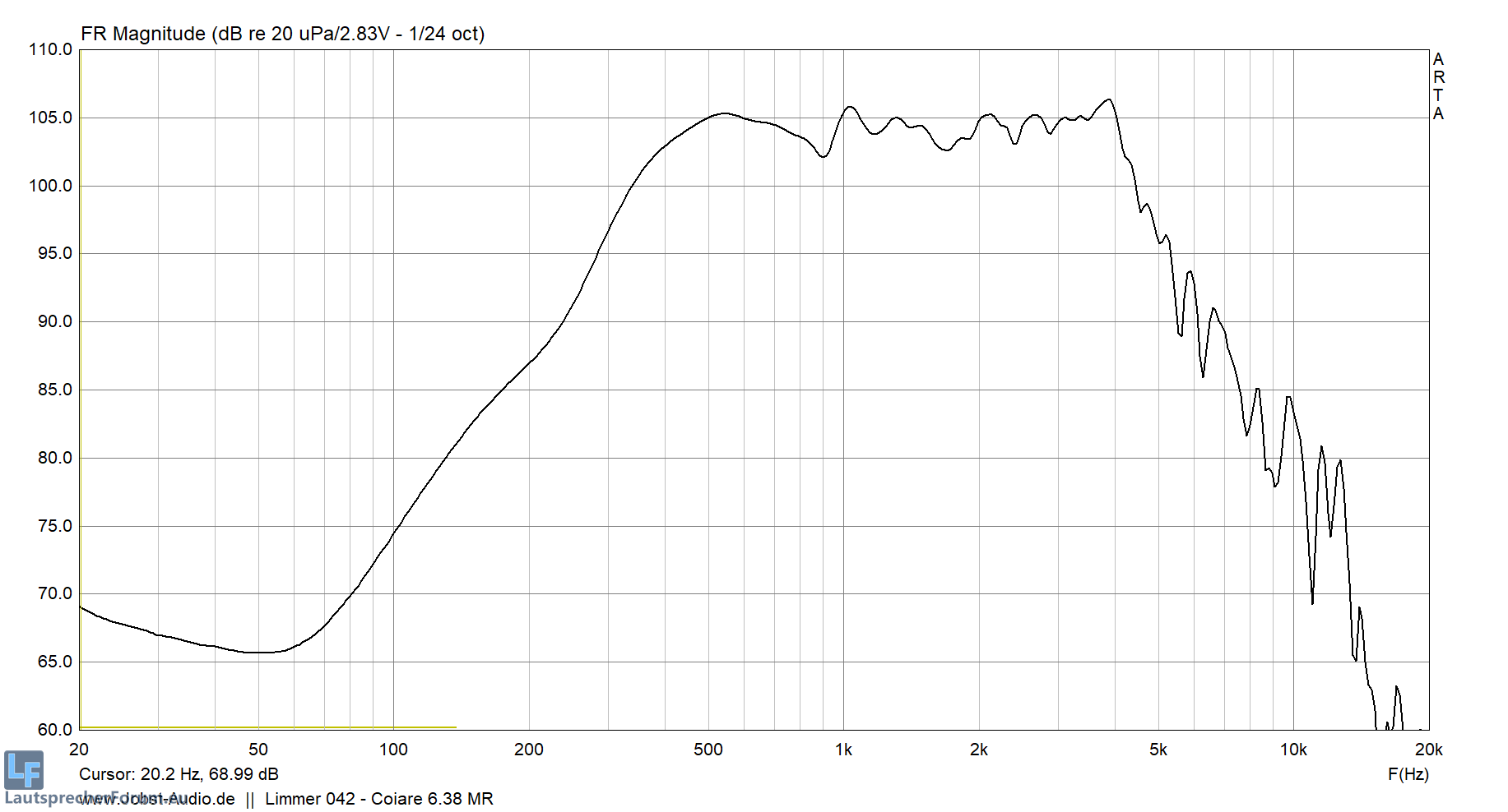 Auffällig ist, dass bei der mir vorliegenden Messung die Einbauresonanz deutlich tiefer liegt (bei 220Hz) als bei deiner Messung. Durch die Größe der Rückkammer lässt sich das nicht erklären. Wäre es ggf. möglich, dass bei deiner Messung, Jobsti, der Ciare nicht sauber am Flare montiert war und zu viel Abstand zum Phase Plug hatte, oder wie lässt sich die beträchtliche Abweichung erklären? (am augenscheinlich zu geringen Messpegel dürfte es ja nicht liegen, der macht zwar etwas "zappeln", auf die Position sollte das aber keinen Einfluss haben).