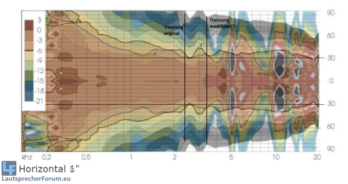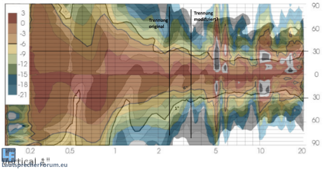 Man sieht doch recht gut, dass der 6" ab 3,5khz relativ stark zusammenzieht, da sollte man doch davor schon rausgehen, auch wenn es nicht ganz so früh sein muss wie im Original. Nunja, vielleicht offenbaren doch die Klirrmessung oder das Zerfallspektrum noch die Gründe für die recht tiefe Trennung im Original, dafür dass der MT hier doch nach vorliegenden Erkenntnissen noch ziemlich sauber spielt.