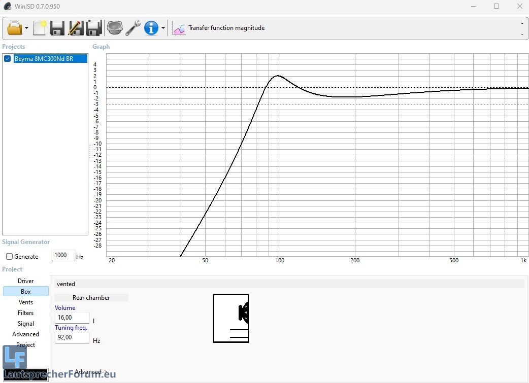 Aktuell hab ich Beyma 8MC300Nd in 16L@92Hz. Die brauchen bei 160Hz einen Push und bei der Tuningfrequenz muss man 2-3dB rausziehen. Dazu kommt ein Filter für den BaffleStep und zwei für die Kantendiffraktion.