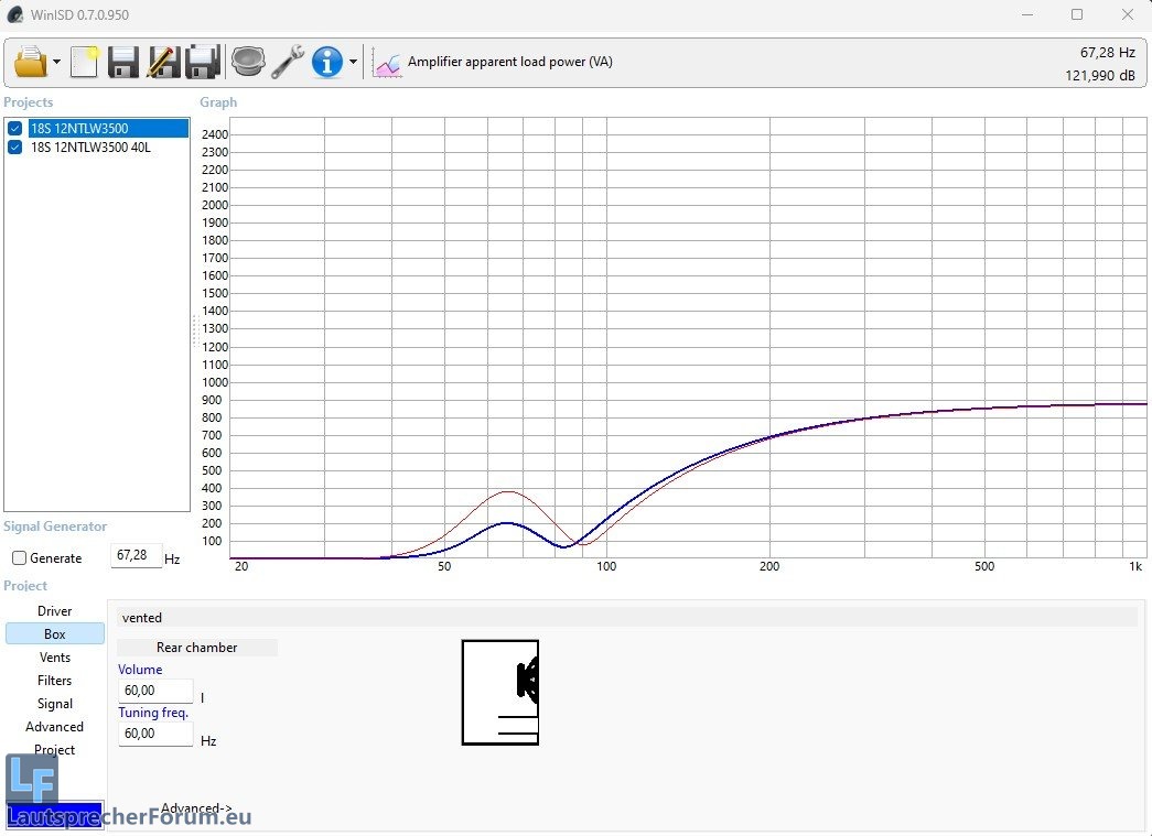 Hier mal der Vergleich 40L(rot) gegen 60L(blau) jeweils mit 60Hz Tuning.