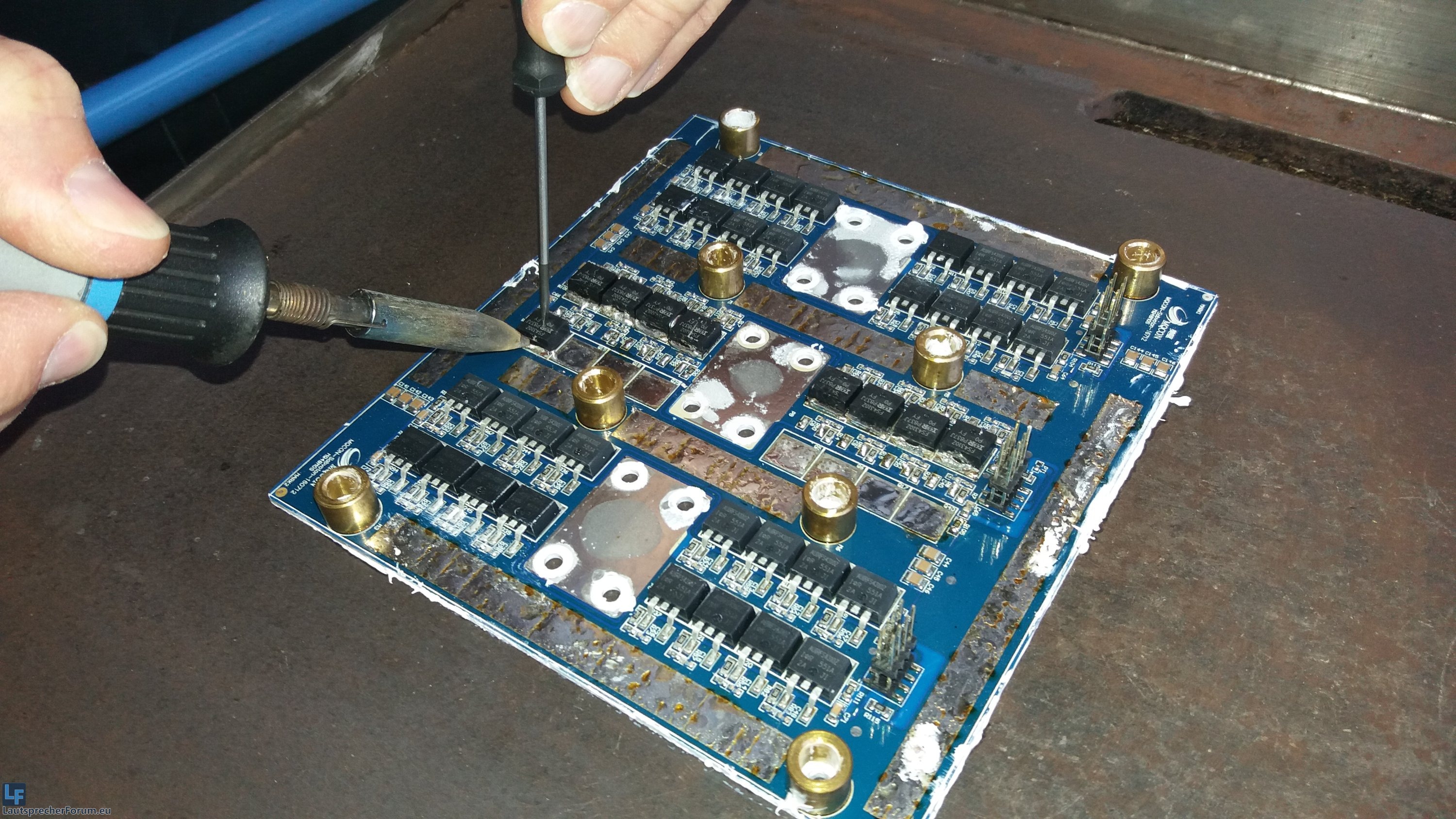 ...........und dann auch noch die Variante mit den ON-Semi TO3 Transistoren - ohweh. Das ist das alte "Murkskonstrukt", wo nur 5 pro Halbwelle passen, und der zweite MosFet so unglücklich auf der Bestückungseite dazugebastelt wurde. Vollkatastrophe, die dazu auch noch aus einem FP14000 Netzteil versorgt wird (für 4 Kanäle).