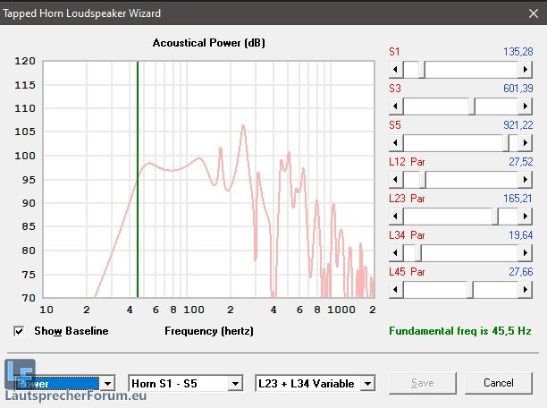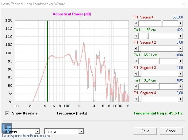 die letzte Simu zeigt auch schon, dass ich das Thema "Bedämpfung" in einem Tapped Horn nicht völlig aufgegeben habe, sondern, dass gezielt punktuell eingesetzt eine Bedämpfung immer noch ihren Sinn hat. Vorausgesetzt natürlich, man verliert dadurch keinen Wirkungsgrad.