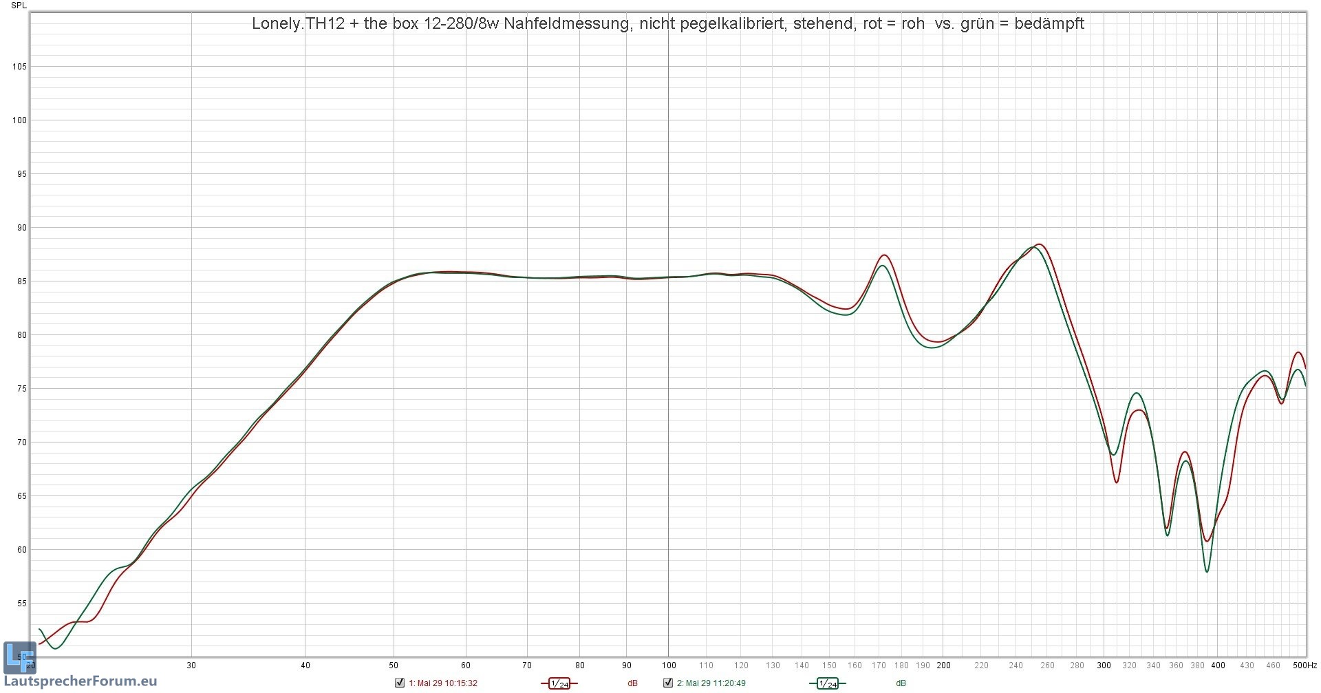 Lonely.TH12 + the box 12-280-8w Nahfeldmessung, nicht pegelkalibriert, liegend, rot = roh  vs. grün = bedämpft.jpg