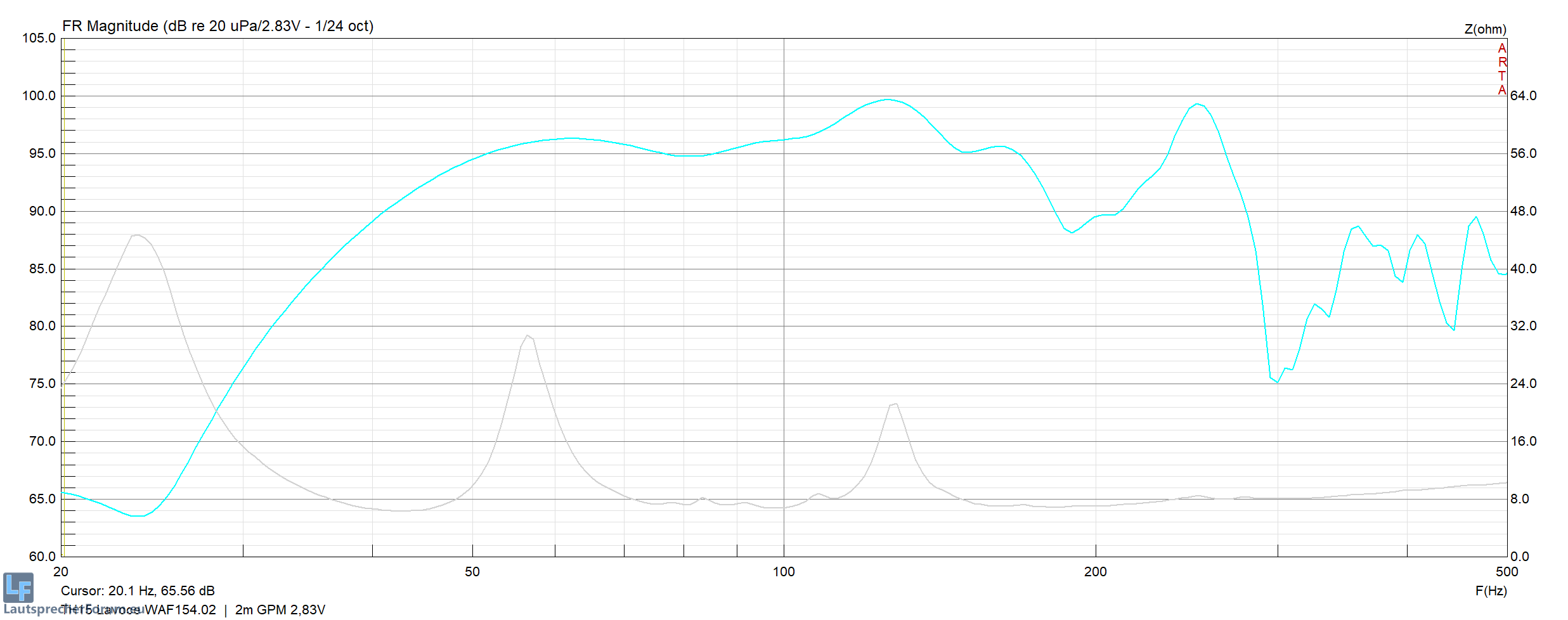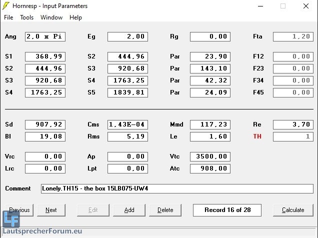 Die Idee, die ich hatte war, Alternativtreiber in Hornresp zu simulieren und bei ähnlichem Frequenzgang, wie der the box 15LB075-UW4, zum Messen des Prototypen zu verwenden. Je nachdem, wie die Messung mit der Simu übereinstimmt, wird man Rückschlüsse ziehen können ob der the box 15LB075-UW4 ebenfalls in meinem TH läuft oder nicht.