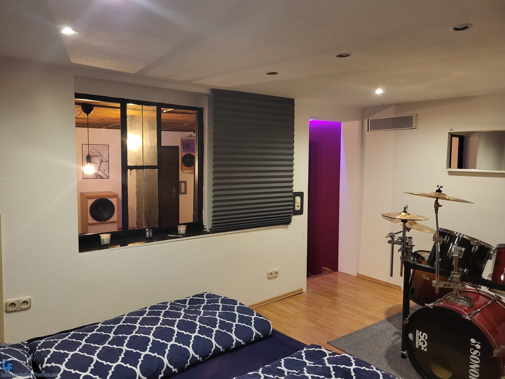 Da der vordere Partyraum über einen Durchgang und ein innenliegendes Fenster über geht in den mittleren Raum (Schlagzeug/ich bin mal betrunken Bett) ergibt sich hier schon eine Raumtiefe von 10 Metern und viele Raumecken.