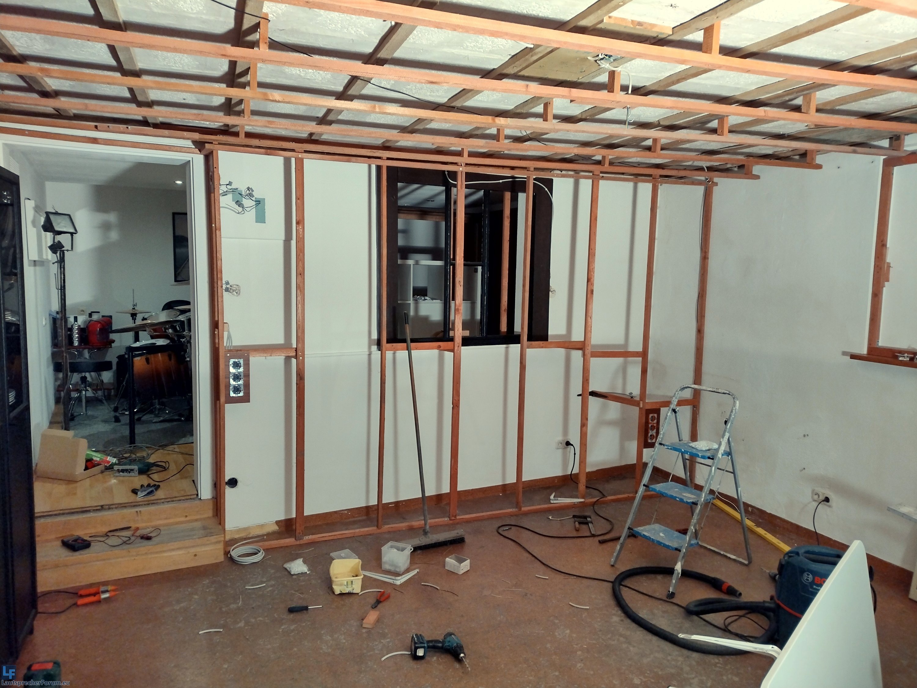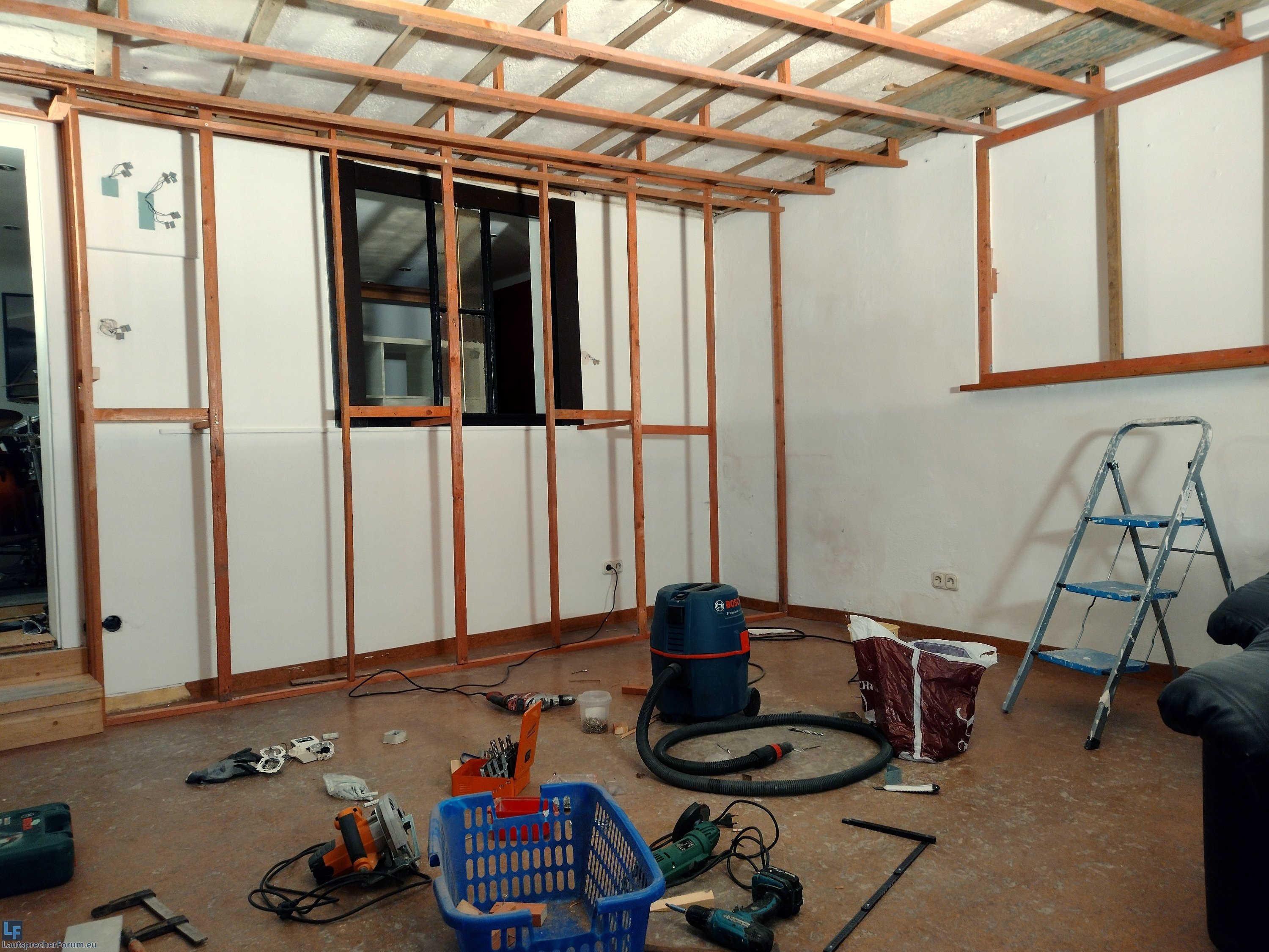 Hierzu werde ich die Glasscheibe aus der Zwischenwand entfernen, Richtung Partyraum eine offene Ständerkonstruktion mit einer Tiefe von 30cm und Richtung Schlagzeugraum von 10cm installieren. Die komplette Wand wird dann (auch der Wanddurchbruch des Fensters) mit Steinwolle offen ausgedämmt. Hierfür habe ich mir gestern 4m³ Steinwolle besorgt.