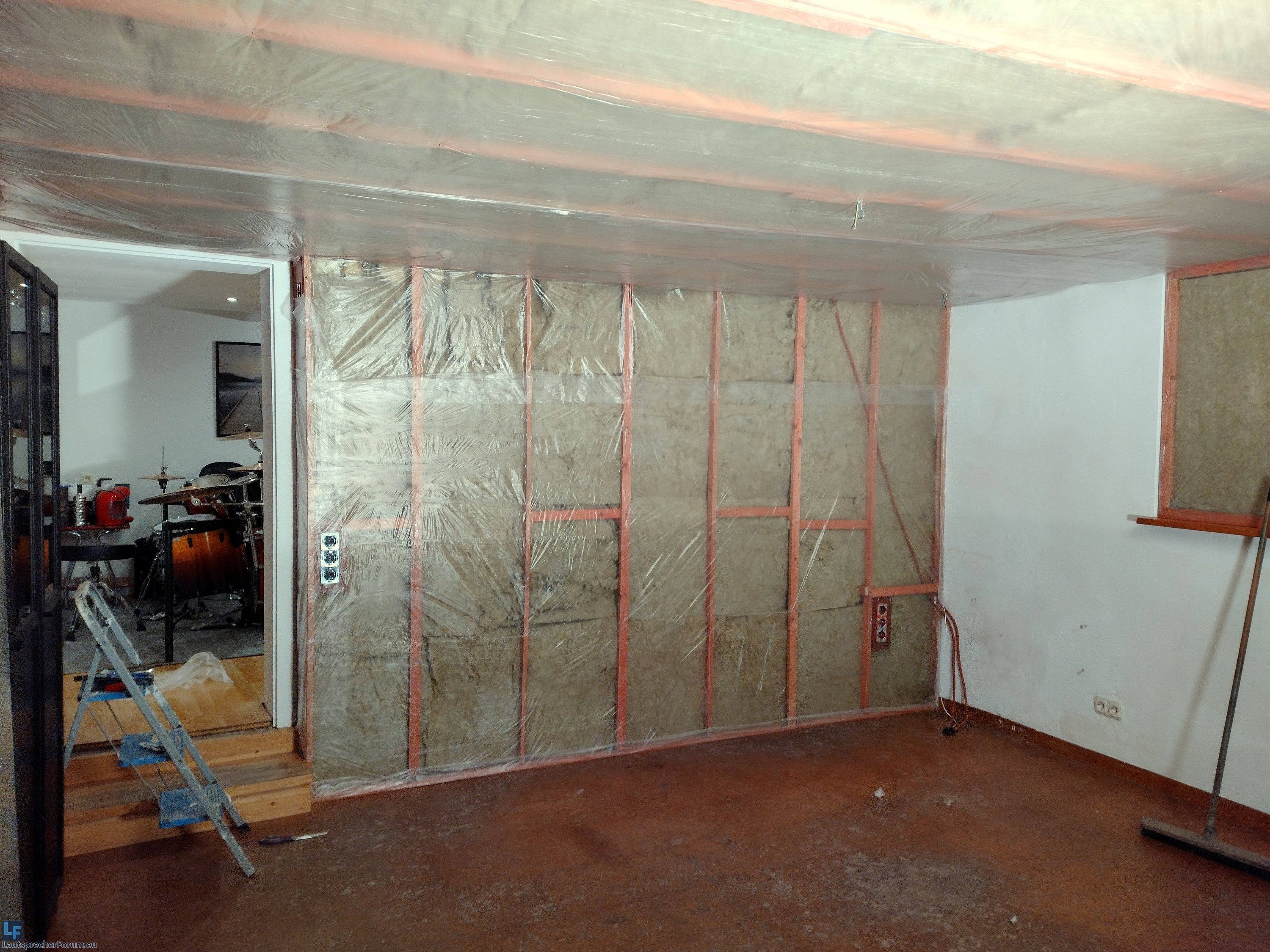 1. Die Trennwand zwischen Partyraum und Schlagzeugraum wird mit bis zu 40cm Steinwolle abgedämmt - der Platz ist hierfür vorhanden und die Messungen zeigen dass hier das größte Potential auf Erfolg besteht.