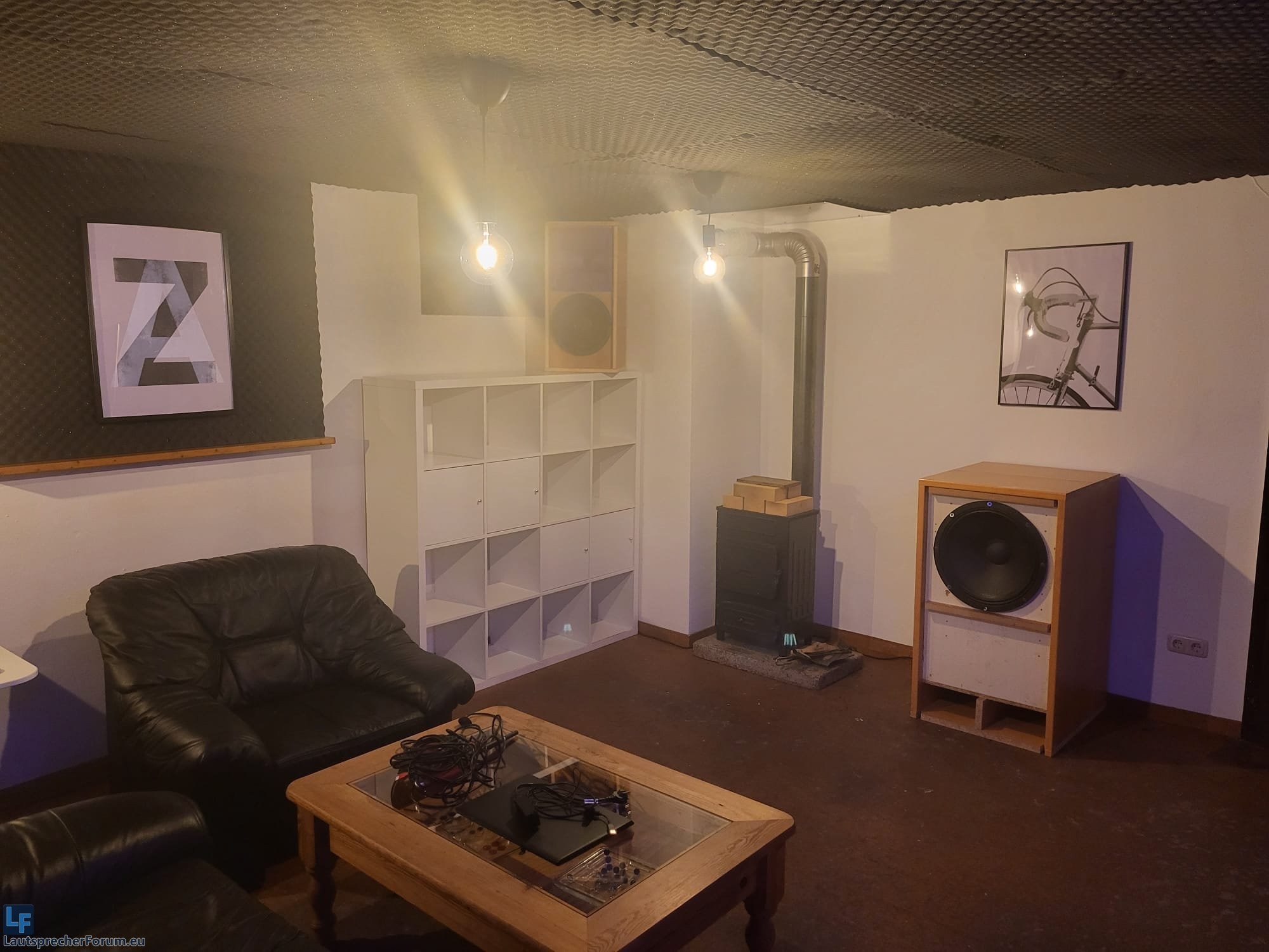 Akustisch ist im Bass das Hauptproblem eine Mode bei rund 30Hz die ca. 15dB ausreißt, mehrere Auslöschungen zwischen 100Hz und 200Hz und eine je nach Abhörposition extrem unterschiedliche Basswiedergabe.