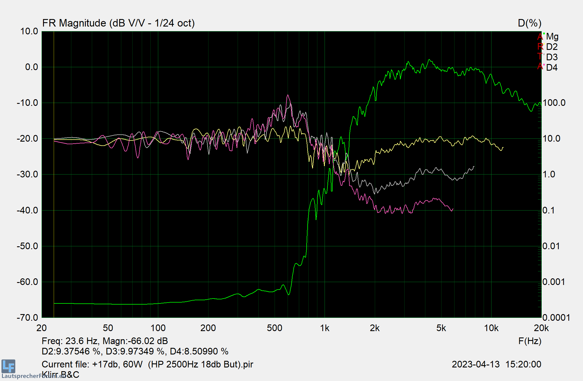 Der Vollständigkeit halber noch der HT, auch wenn der erwartungsgemäß eher nicht "ins Schwitzen kommt", da er ja entsprechend hoch getrennt wird. Die Messungen bei niedrigerem Pegel wurden gemacht, habe ich aber hier weggelassen - das Bild ist wie zu erwarten (recht hoher K2 auch bei niedrigerer Leistung, k3 klirrarm). Für eine Trennung unter 2khz ist der DE360 wie zu sehen eher nicht oder wenn dann nur in kleinen LS geeignet - in der 3-Wege Konstellation passt er aber gut rein und bleibt selbst bei 60W noch im Bereich von 1% k3. Da er insbesondere im Superhochton sowohl klirrarm wie auch ohne Nachschwinger ist kann man hier guten Gewissens etwas "Glanz" einziehen (zumindest für die, die noch so hoch hören...