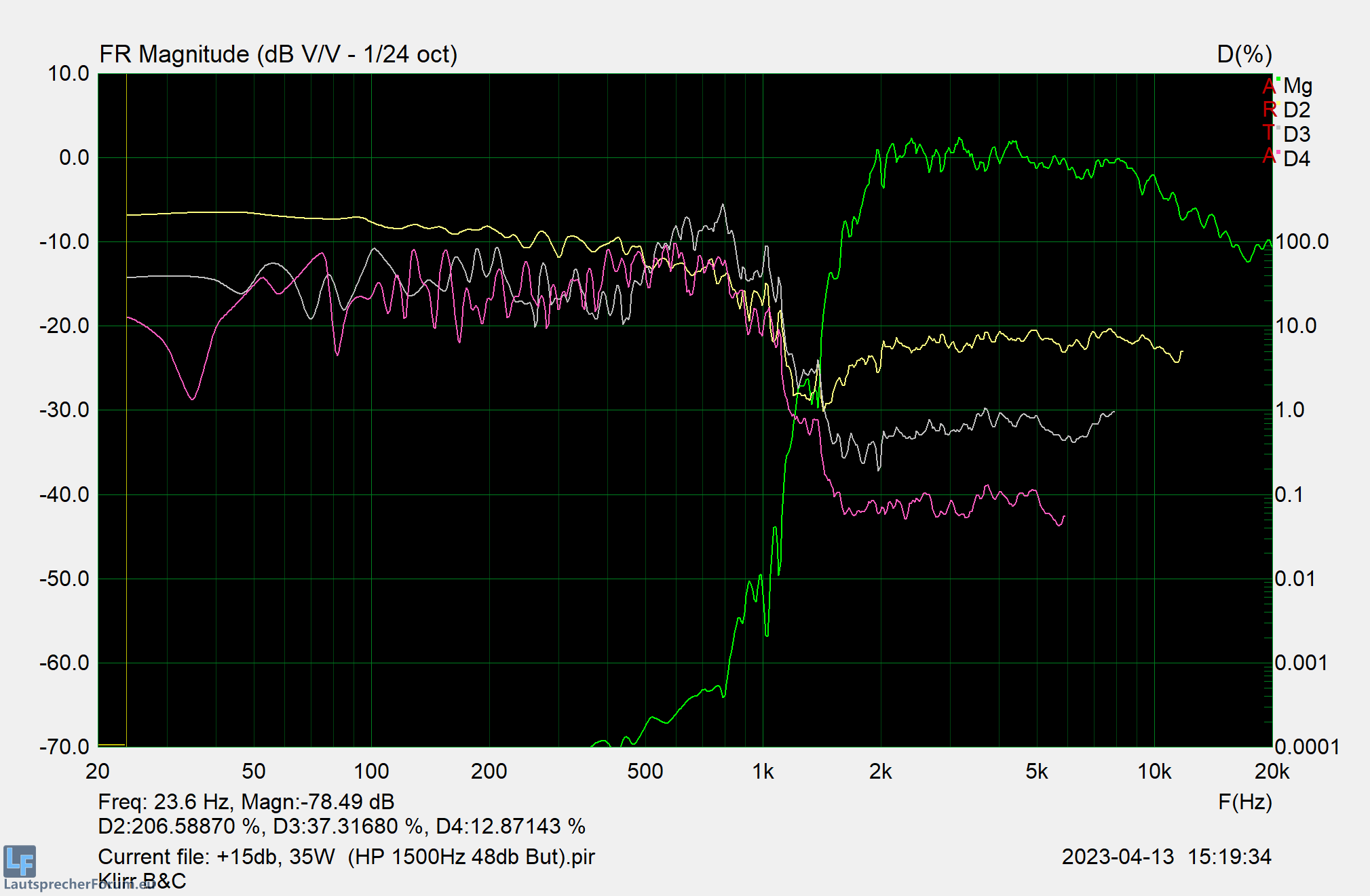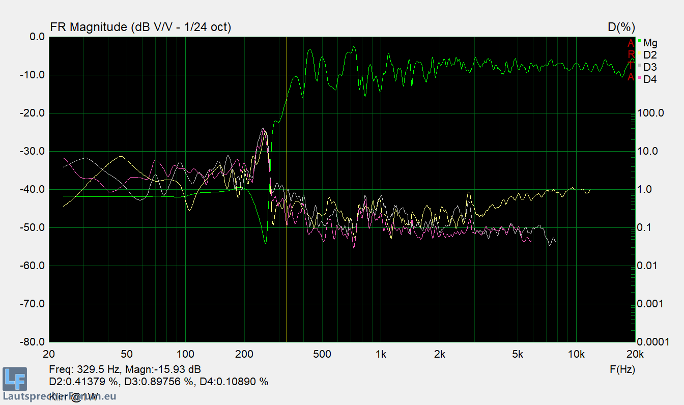 Neben dem Ausschwingverhalten besonders interessant sind nun die Verzerrungsmessungen. Mit Rücksicht auf das Chassis wurde eher konservativ gemessen - damit die Bewertung dennoch aussagekräftig im Hinblick auf die spätere Verwendung ist, mit 3 verschiedenen HP-Filtern.