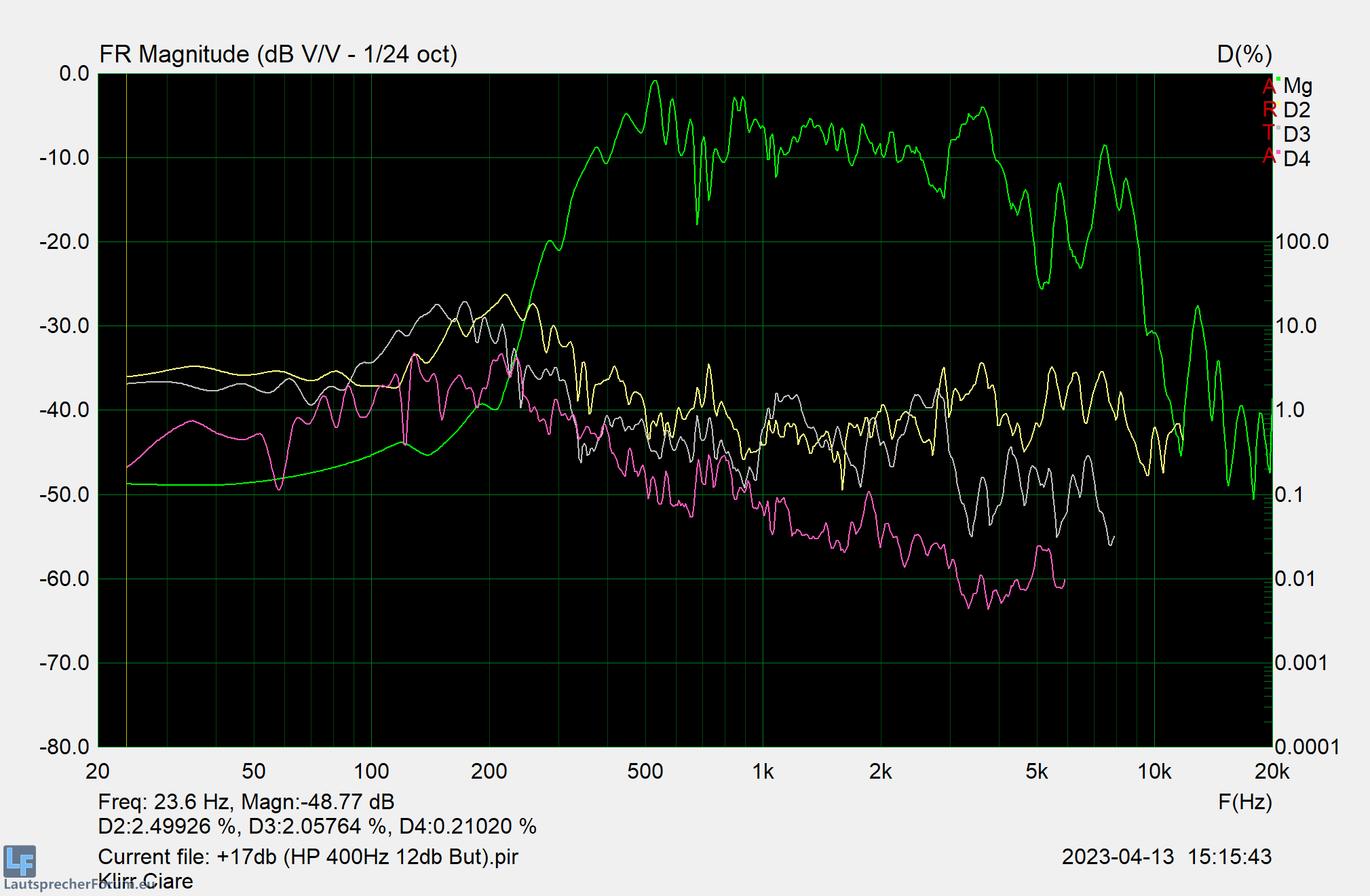 Der Ciare kann doch ziemlich laut und ist im Mittelton mit 100W noch lange nicht am Ende. Auch bei der spannenden Frage, wie es im Bereich um 500Hz herum aussieht gibt es Entwarnung - "unangenehm" wird es dem Chassis erst unter 350 Hz, die verhältnismäßig hohe Trennung der Originalweiche hat also nichts damit zu tun, dass der Ciare bei 500Hz entlastet werden muss. Mehr dazu weiter unten.