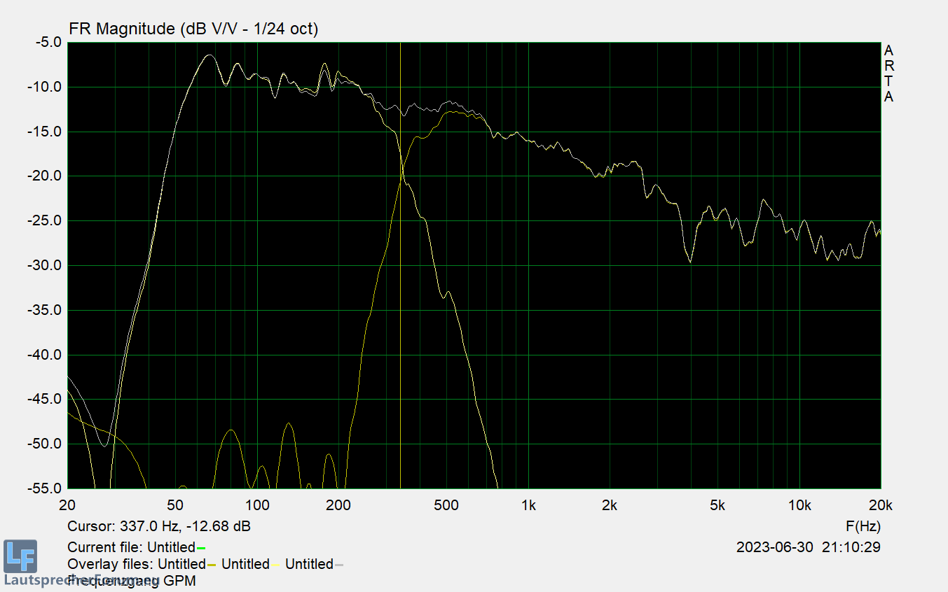 Zuletzt einmal noch das als GPM ausgearbeitete Setup. Der Bass spielt hier bis 90 Hz / But 18 nach oben, der TT im Top bis ca. 60 Hz nach unten. Grundsätzlich funktioniert der parallele Betrieb der unterschiedlichen LS prinzipiell - allerdings haben insbesondere die Charakteristik des LP und die Steilheit des HP erheblichen Einfluss auf die Phasenlage.