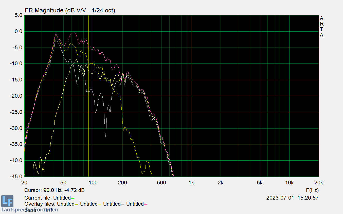 Erfreulicherweise leuchtet hier bei Limit des TT am Flare gerade die -10db - das ist ja durchaus bekannt, da der MT in der bei mir eingesetzten Trennung bei 350 Hz doch ein paar W mehr abbekommt ein Punkt - aber auch hier kein Problem.