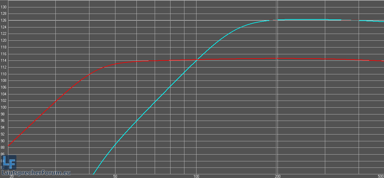 Bis wir an's Xmax stoßen, sind hier im Vergleich zu rot ganze 12dB mehr Schalldruckpegel drin.