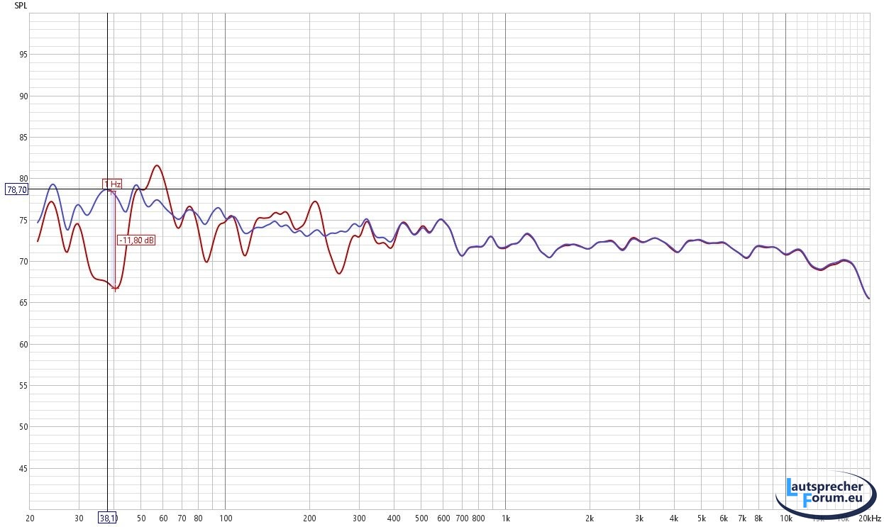 betreffend der größten Abweichung vermute ich, dass du bei etwa 33 und 43Hz tatsächlich ZWEI Täler hast, und dass DAZWISCHEN bei ca 38Hz massiv zur Maskierung angehoben wird ...