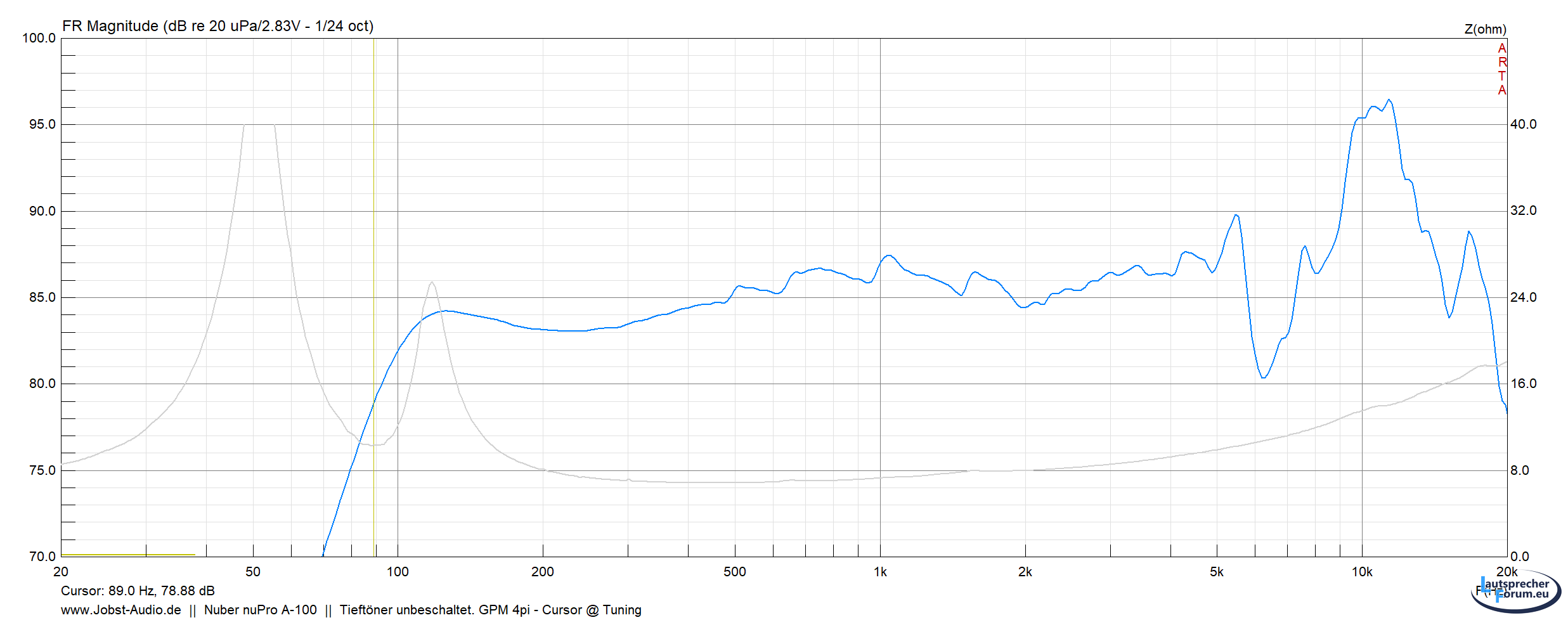 Getuned ist die Box bei circa 90Hz. Laut Zmin 87Hz, laut elektrischer Phase 97Hz.