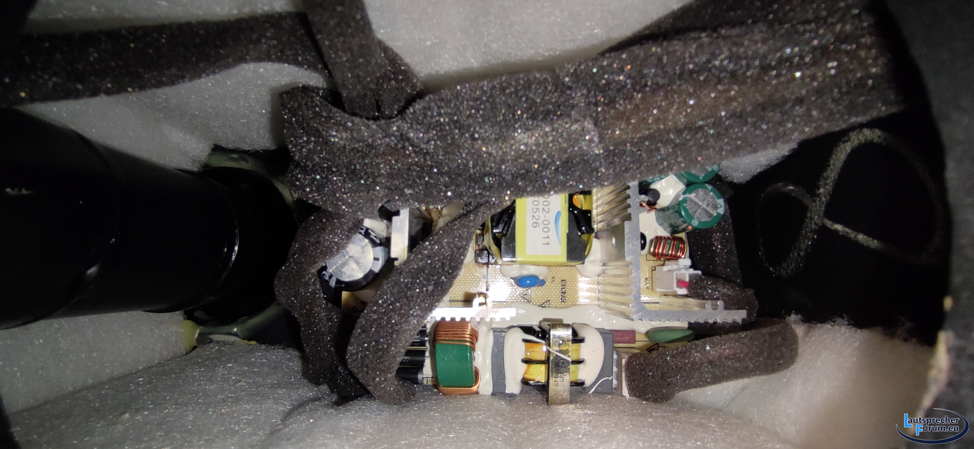 Das Gehäuse scheint aus MDF zu sein samt vernünftiger, schwarzer Lackierung.