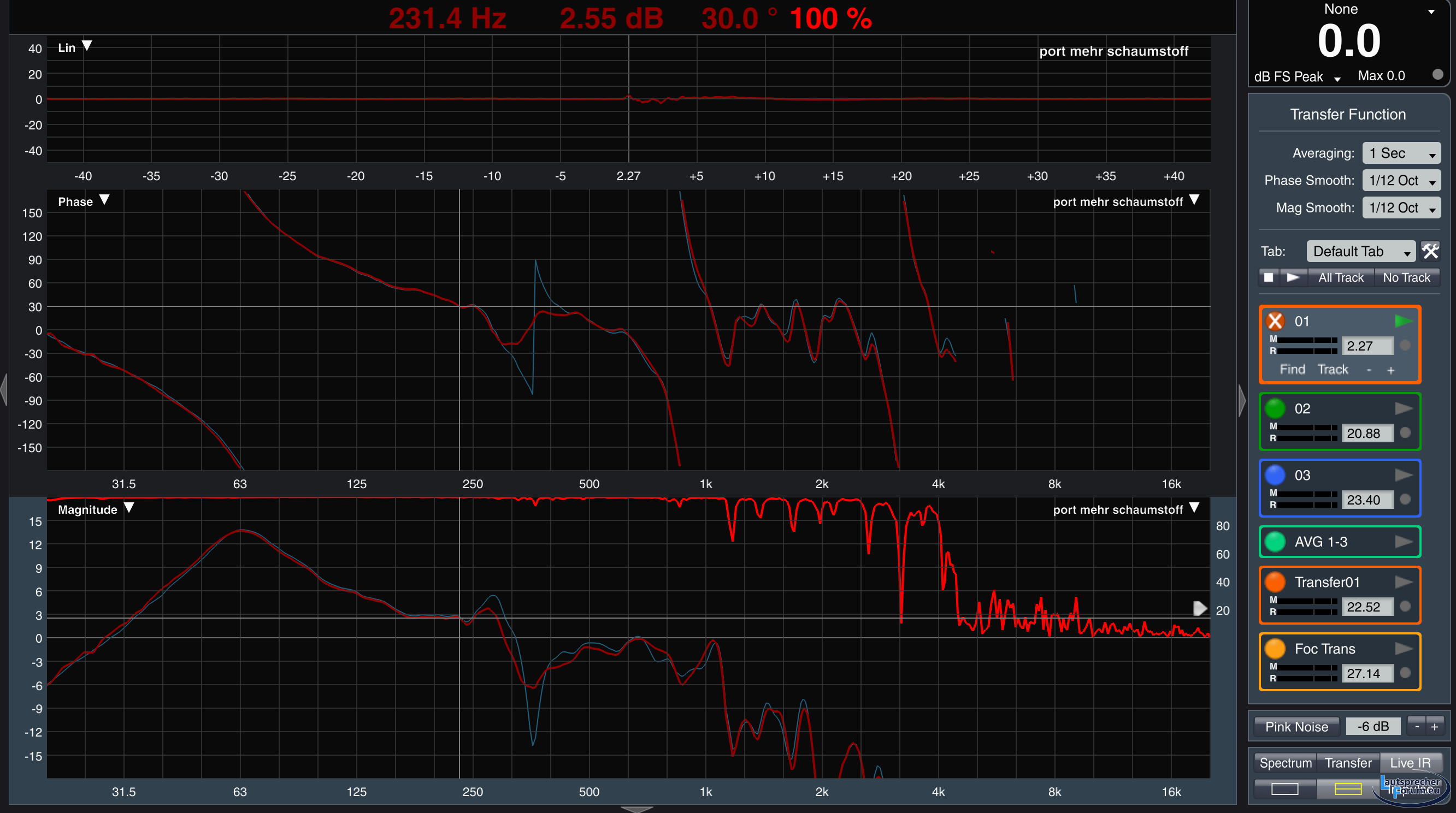 So, habe heute mal den Port vom doppel 15er gekürzt. Habe ca. 25cm weg genommen und bin dann auf etwa 56Hz Tuningfrequenz gekommen. Portreso ist besser geworden, scheint aber noch nicht ganz weg zu sein. Ideen, wie man das noch verbessern kann? (Dämmung, Port 2teilen oder oder ?).