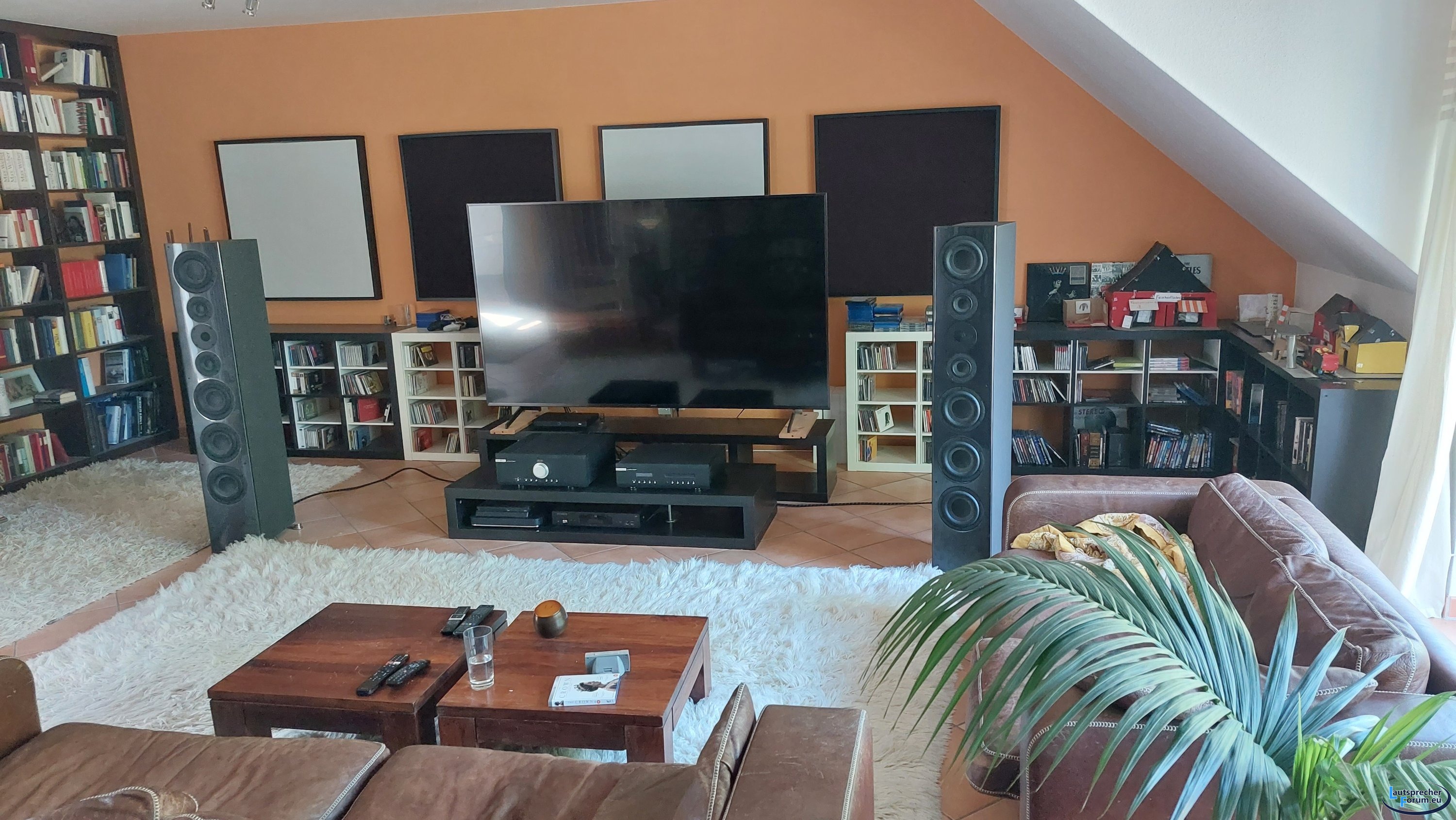 Hinter den Boxen sind 4 qm Absorber, hinter dem Sofa sind in den einzelnen Fächern des Bücherregale ebenfalls Absorber.