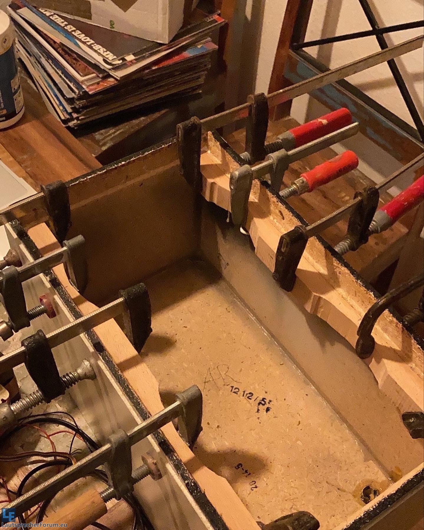 Also mal flott einen Anschlag aus Verschnitt gebaut, die Schallwand komplett bis Unterkante ausgefräst und umlaufende Leisten aus Buchenholz aufgeleimt, an der später die Schallwand verschraubt werden soll.