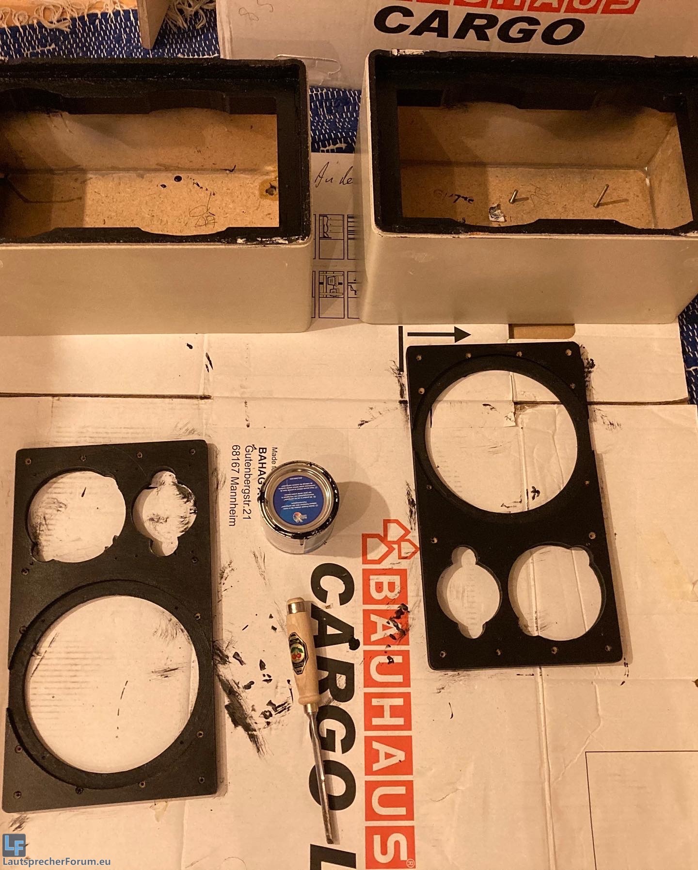 Ab da war es erklärtes Ziel des Projekts, der Box erstmal einen neuen Tieftöner zu spendieren, was aufgrund der Bauform der ursprünglichen Bestückung kein ganz einfaches Unterfangen war und einen kompletten Austausch der Schallwand bedeuten würde.