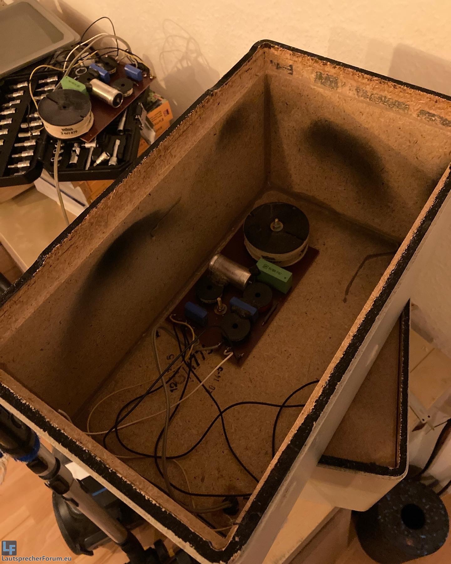 Dabei offenbarte sich natürlich zuerst, dass man einen Tieftöner nicht ohne Dichtband auf zu kleinem Ausschnitt verschrauben sollte.