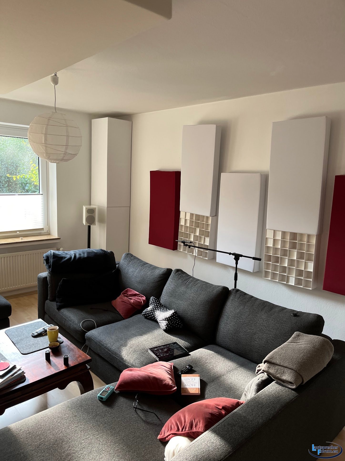 Ich habe dann Bassfallen [/url=https://gikacoustics.de/produkte/pib-portable-isolation-booth/]und [url]mobile Akustikwände zum experimentieren bestellt. Das sah dann so aus. Achtung: es ist alles noch provisorisch aufgebaut.