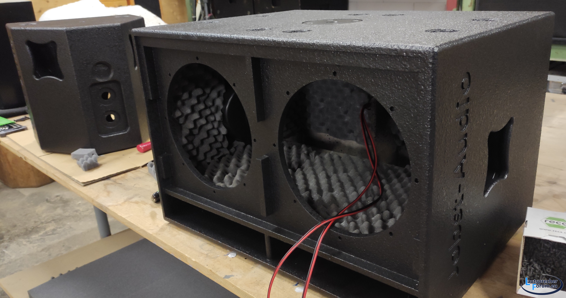 Ist ein separater Raum , zwischen der Elektronik Kammer und der Lautsprecher Kammer ist eine separate Holzwand wo nur die Ls Kabel durchgehen welche sorgfältig mit Silikon abgedichtet wurde [ externes Bild ]