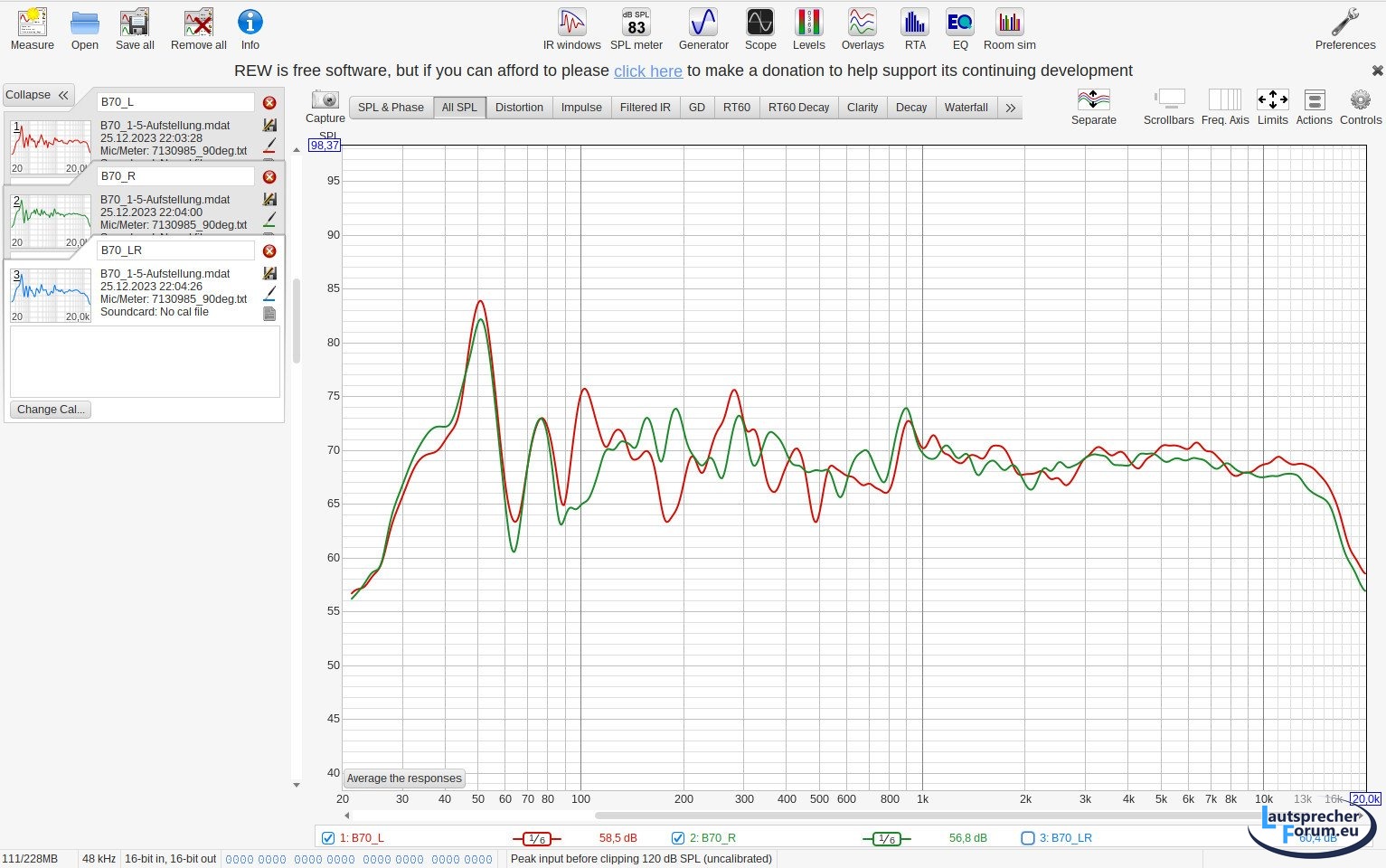 Eigentlich habe ich mir mit der neuen Aufstellung mehr erhofft, gerade im Bereich von 50 Hz. Klanglich fand ich die neue Aufstellung im Bassbereich etwas dünn. Liegt evtl. an den Auslöschungen im unteren Bereich. Messfehler?