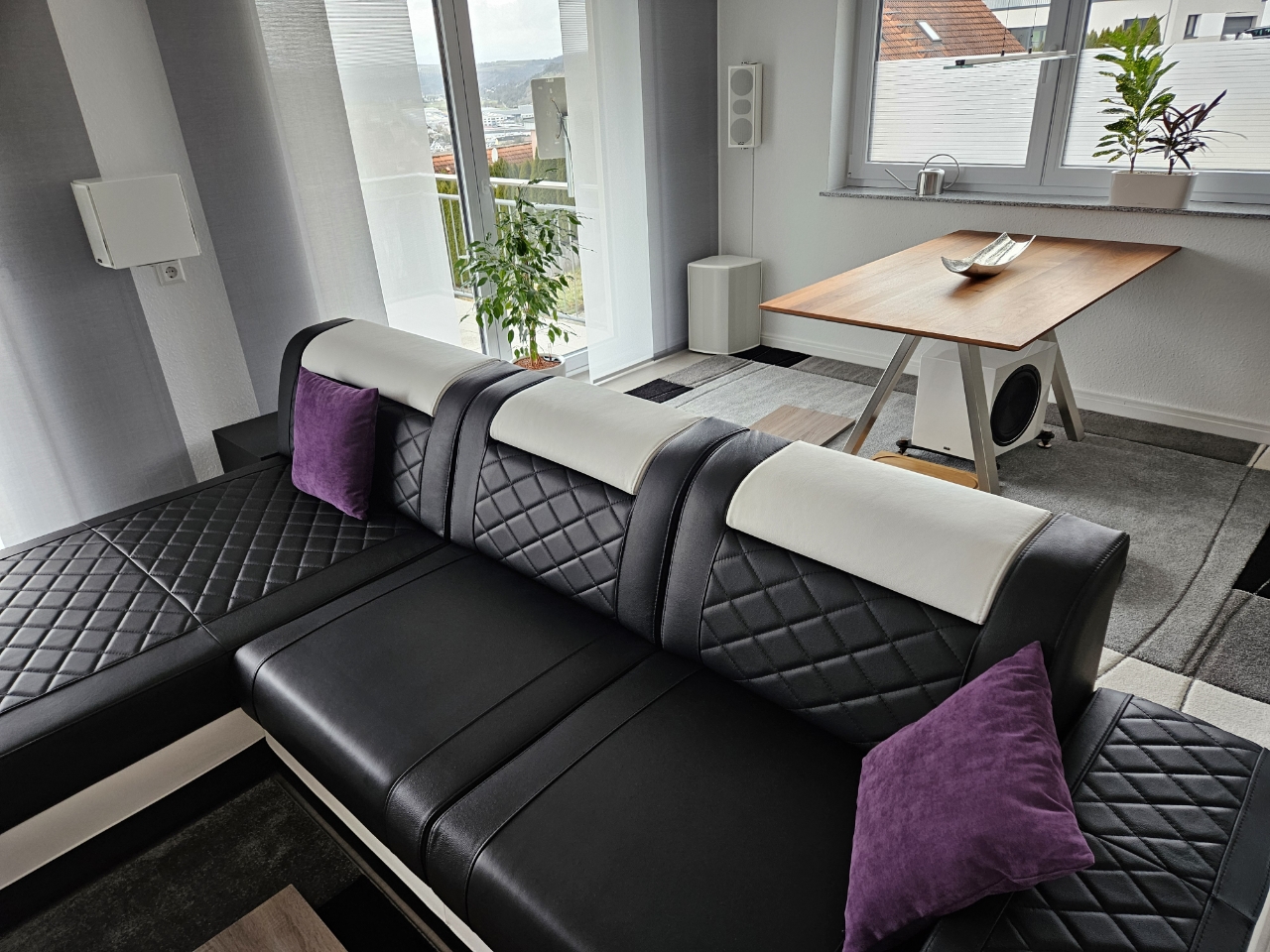Ein wenig Abstand, dann folgt in Raummitte ein fast 2 Meter tiefes Ecksofa mit Couchtisch. Die Position in Raummitte schafft ganz schöne Probleme, aber als ich das alles geplant habe und mich für diese Wohnung entschieden habe, hielt ich Symmetrie im "Heimkino" noch für was Tolles und "Raummoden" für gerade angesagte Astronautenbekleidung.