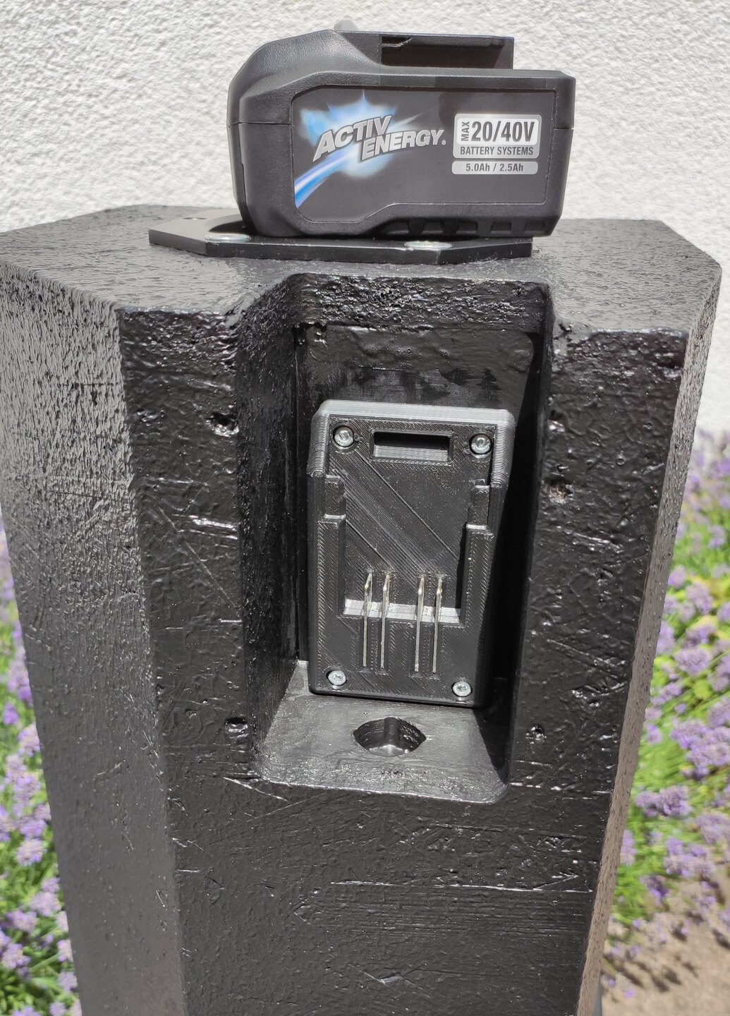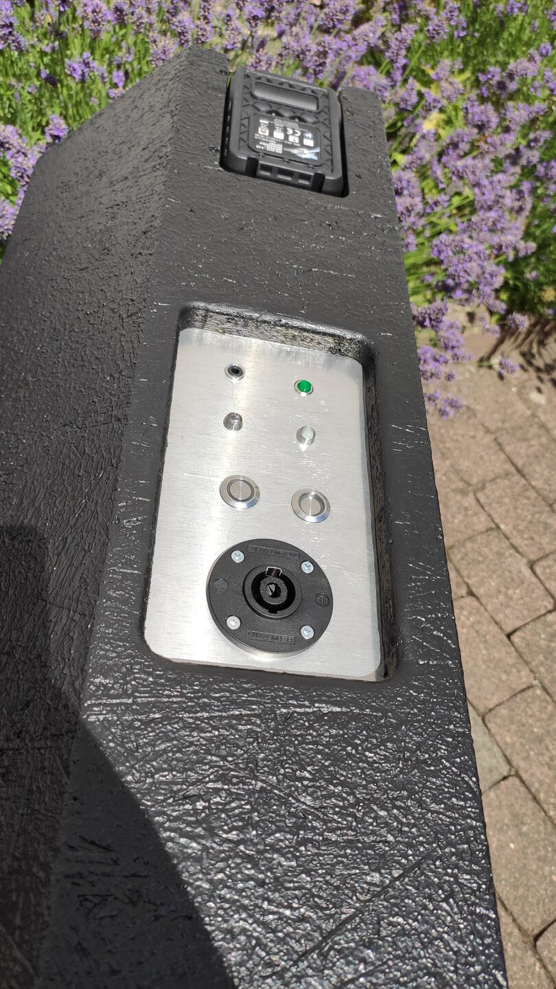 Nach viel probieren habe ich dann einen Lautsprecher extra für diesen Zweck entwickelt. Zwei 6,5 Zoll Tieftöner mit viel Tiefgang, die eigentlich für Studiolautsprecher gedacht sind, und darüber die Standard HT Horn Kombi von Sica, die auch im LF-Sat12 steckt. Als Verstärker/Bluetooth Empfänger/DSP nutze ich den JAB 5 von Sure. Akku ist der billigste 36V Liion Werkzeugakku den man kaufen kann, der 20V/40V Active Energy Akku von Aldi. Dafür gibt es auf Ebay von palodesign 3D gedruckte Halter mit den Kontakten hinten. Der Lautsprecher ist Vollaktiv, also jeder Treiber hat seinen eigenen Verstärker Kanal, und der Adau 1701 DSP ist die Digitale Frequenzweiche.