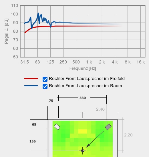 Setting Abstände 4 m Wand, 1.2 m zu Seiten, stereo 3-eck: 240 x 160 x 160 cm, 5° auf Achse.