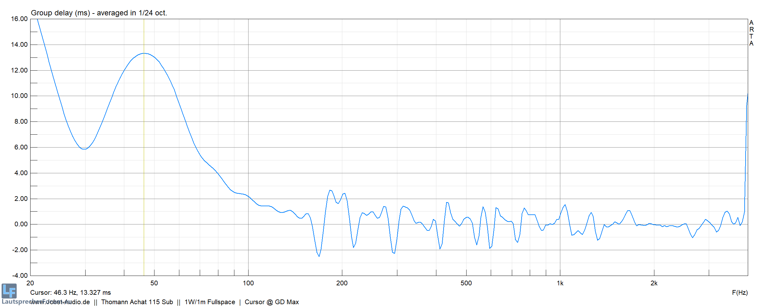 Durch den EQ und steilen Filter heben wir die GD auf ganze 42ms an (45Hz), oberhalb 50Hz dann eher nur noch im Bereich +5 bis +10ms gegenüber dem "Original".