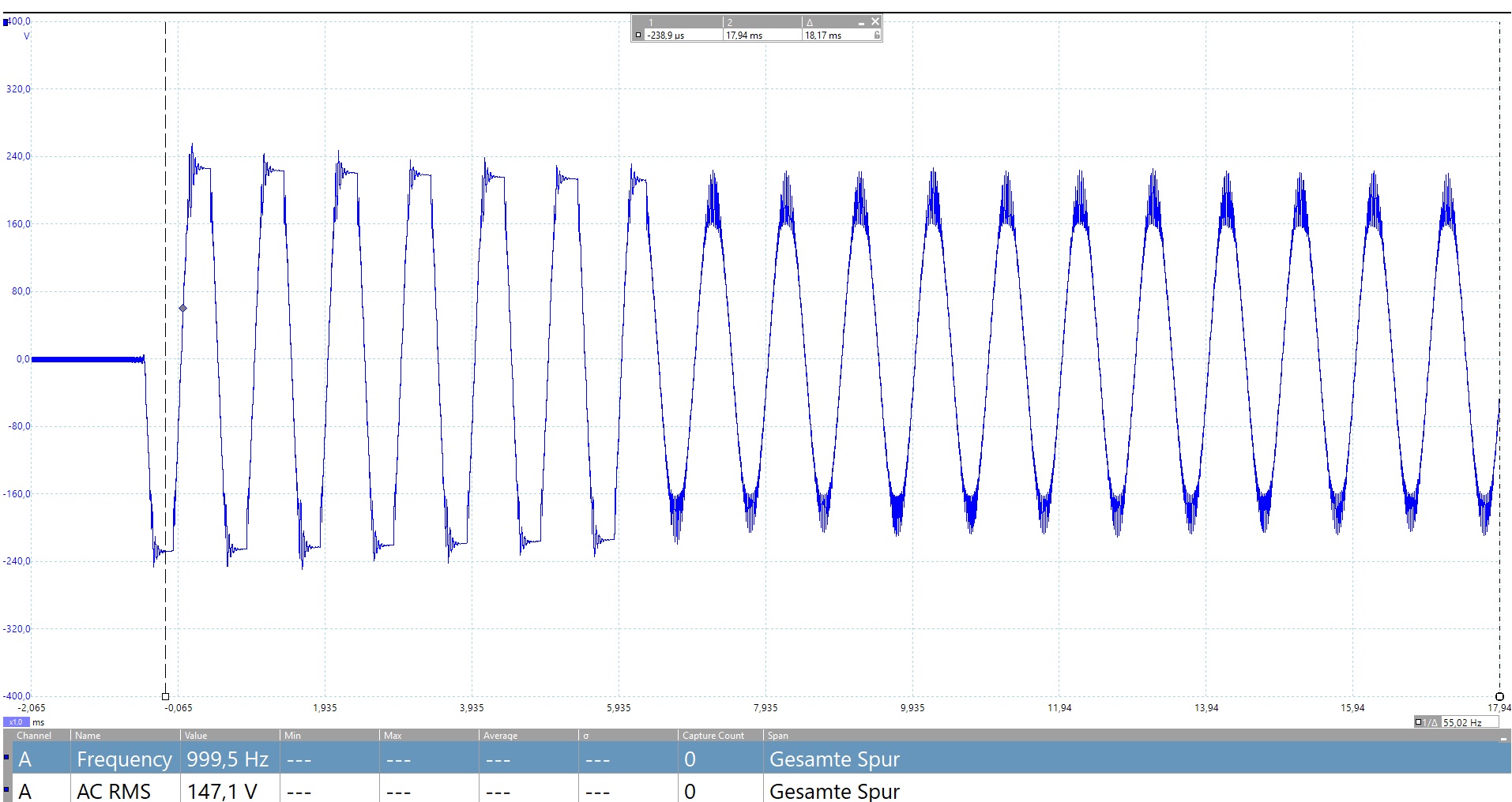 Schauen wir mal auf das Übersteuerungsverhalten: Hier erkennt man, dass die Endstufe ca. 6ms benötigt, um die anfängliche Übersteuerung durch den internen Limiter zu begrenzen. Das gelingt auch ganz gut und resultiert in einer stabilen Amplitude. Die Ausfransungen oben und unten am Sinus sind typisch Klasse-D mit Ausgangsfiltern etc. Das sieht bescheiden aus, und ist absolut nichts für HiFi Puristen - dennoch fällt das nicht negativ in den THD Messungen auf. Die Klirrwerte habe ich übersichtshalber nebenbei gesehen, aber nicht dokumentiert. Das lag alles im Rahmen unter 0,1%.