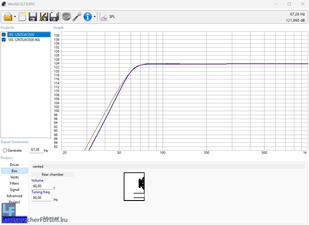 Hier mal der Vergleich 40L(rot) gegen 60L(blau) jeweils mit 60Hz Tuning.