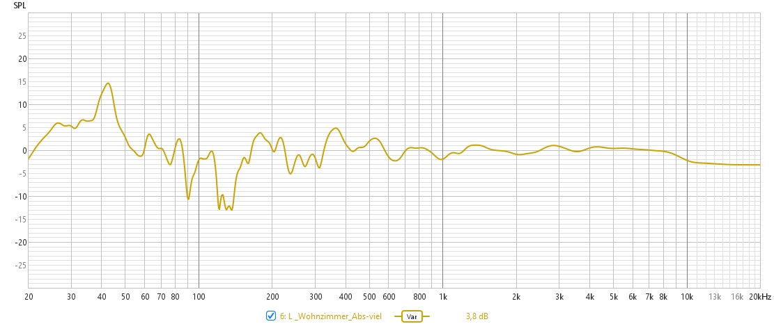 Die Messung bestätigt den Höreindruck. Tiefstbass wird durch das Gebäude absorbiert, Mode bei ~45hz vorhanden. Ansonsten im Bass sehr wild, der rechte LS hat fiese Auslöschungen. Die bekomme ich auch durch andere Hörposition oder verschieben des LS nicht weg.