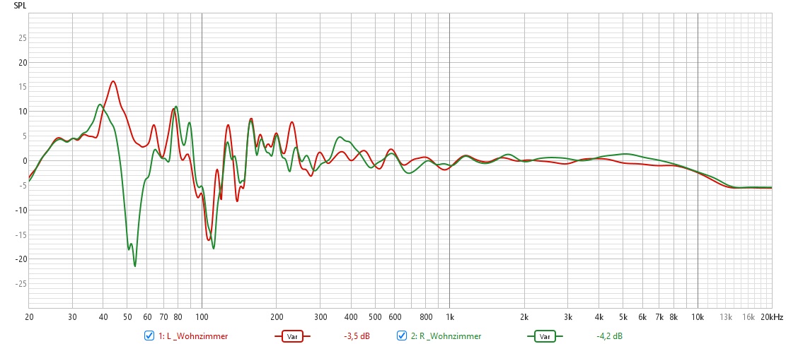 Die Messung bestätigt den Höreindruck. Tiefstbass wird durch das Gebäude absorbiert, Mode bei ~45hz vorhanden. Ansonsten im Bass sehr wild, der rechte LS hat fiese Auslöschungen. Die bekomme ich auch durch andere Hörposition oder verschieben des LS nicht weg.