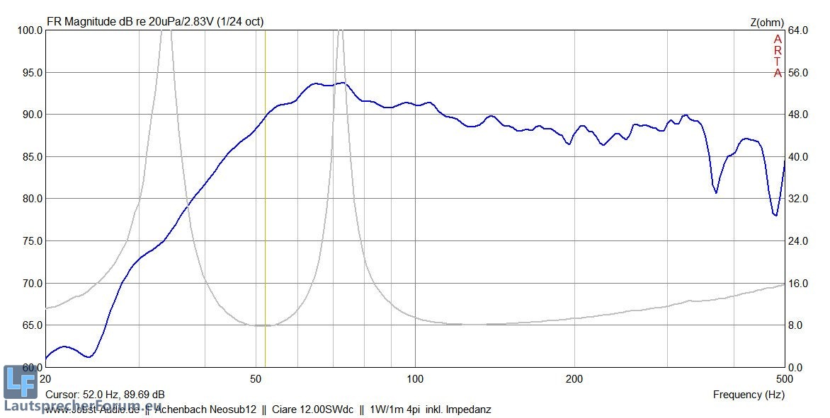Der Anstieg oberhalb 100Hz fällt mit +3dB auch wesentlich höher aus, was eine recht tiefe elektrische XO fordert,