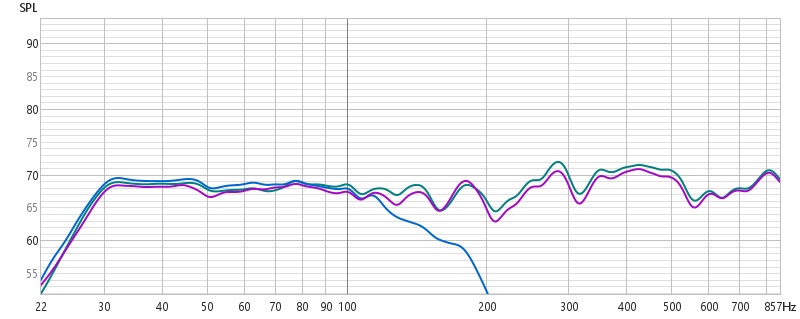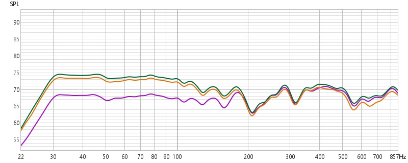 Wie man unschwer erkennen kann, sind die beiden Messungen in Grün und Gelb oberhalb unserer lilanen Referenz. Der Bass wird angehoben.