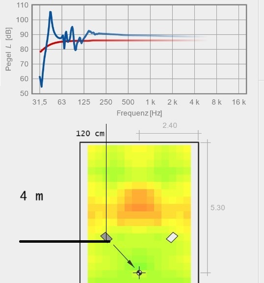 2) Sensationell; das war nun ein best of; 400 cm wandabstand und noch mehr seitlich, 120 cm. Hätte ich nicht gedacht. Laut Hunecke immer noch tiefbass auslöschung, es hörte sich aber nicht so an. Deutlich mehr tiefbass als auf 340 cm und auch wieder tiefstbass (reference track). laut formel auslöschung 22 Hz; das ist tief genug.