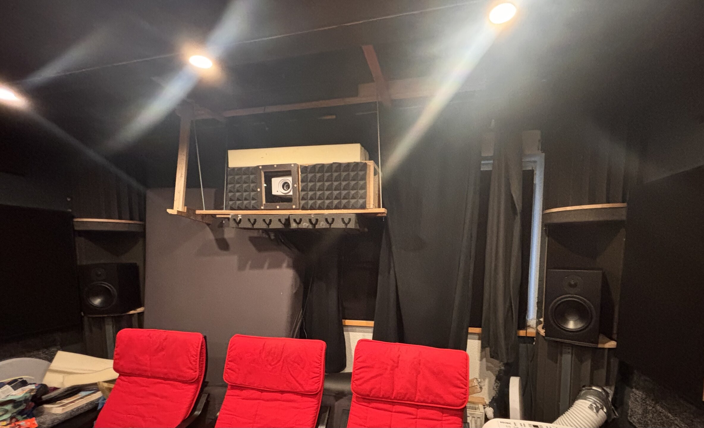 Unten im Bereich der Heizung habe ich das Alte Nuverogitter verbaut damit die Heizungsluft in den Raum abgegeben werden kann, rechts eine Schublade und links eine Klappe um an die Heizung zu kommen zum einstellen und entlüften. Außer das Gitter alles mit 4 cm Schaumstoff verkleidet. Der Beamer ist jetzt nicht mehr zu hören, genauso wie der Zusatzlüfter für die Zirkulation hinter der Wand. steht noch der etwa 20 cm dicke Absorber im Fenster mit ca 2x1 m und Steinwolle Füllung . (Wärend dem Umbau)