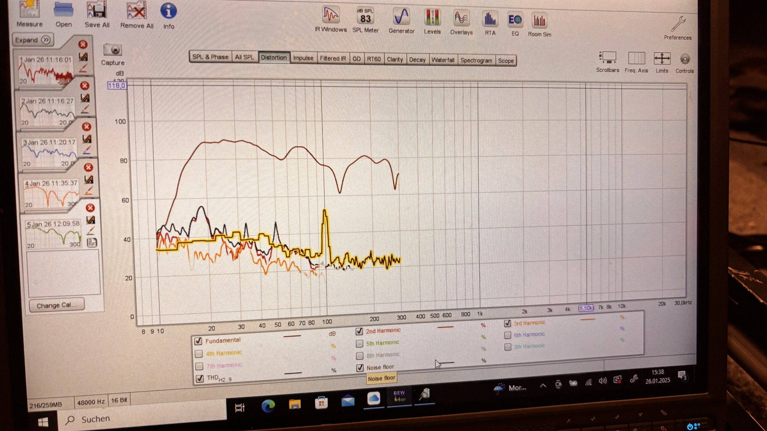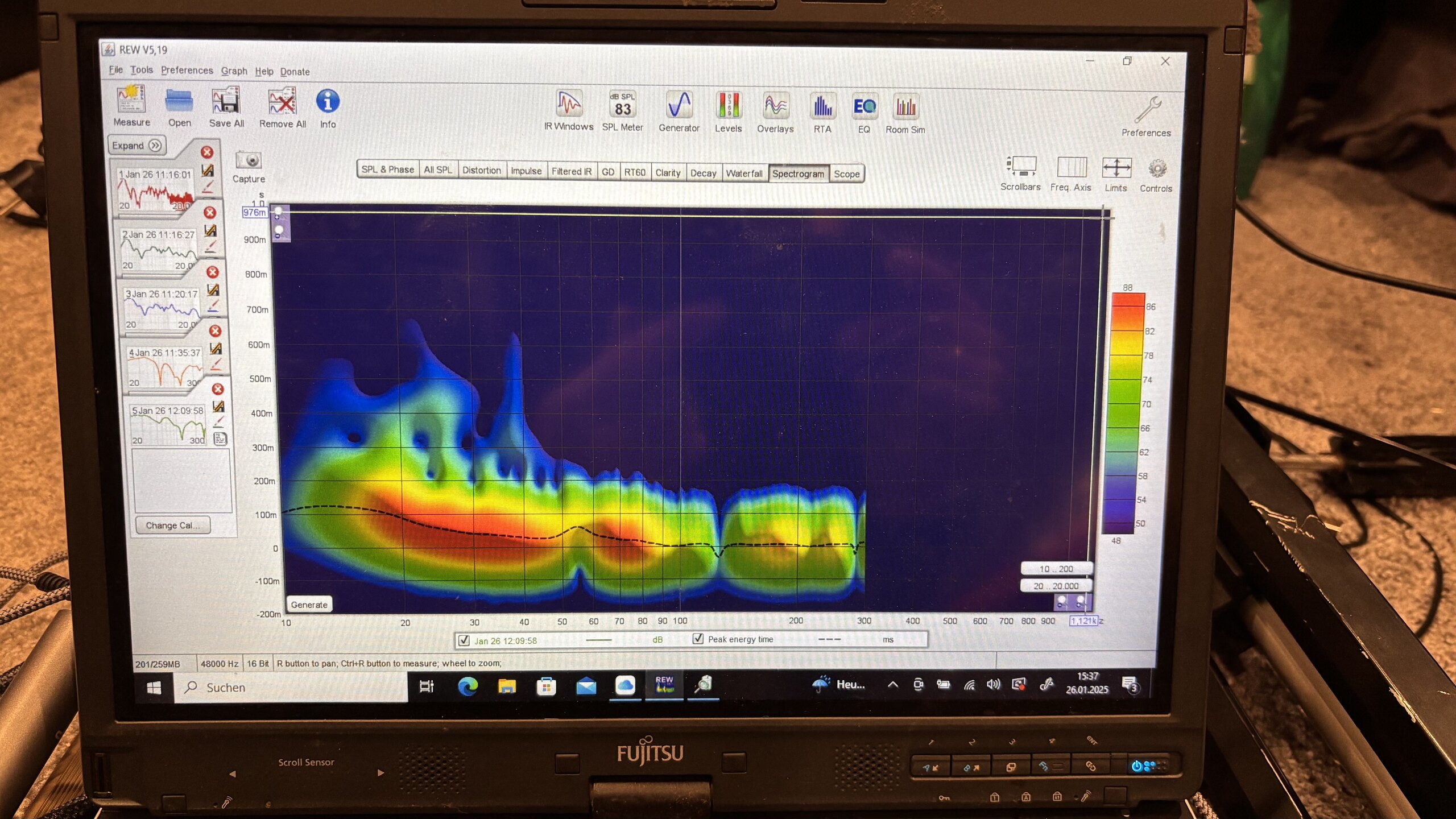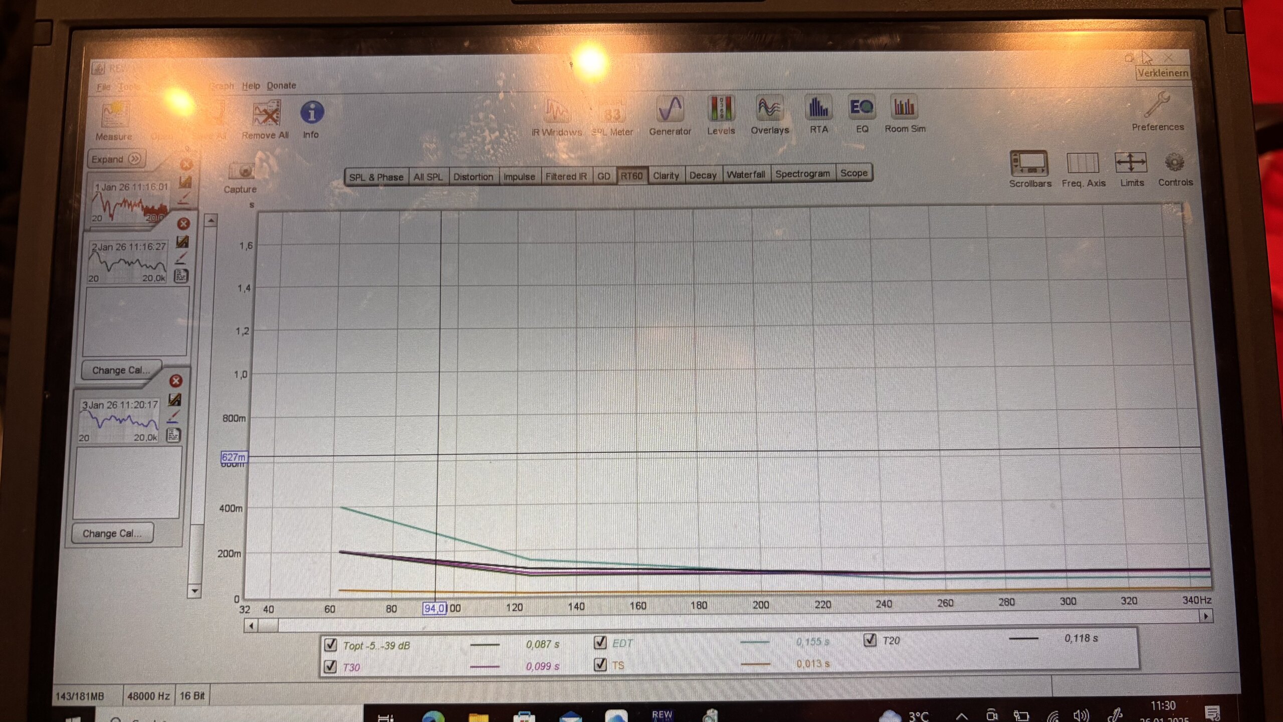 Im Bass am Besten aufs Spectrocgramm schauen, wie lang der Abfall um ca 30db dauert. Das ist bei dir im Tiefstbass ca 500ms, darüber unter 200ms, was ja sehr trocken istChristmas hat geschrieben: ↑27. Jan 2025 08:31 Werde auch nicht wirklich schlau draus wie lang der Nachhall jetzt ist, welchen Wert nimmt man da? Aus dem spektrogramm würde ich sagen bis etwa 30 hz grob um 160-200 ms, unter 30 hz bis über 400 ms.