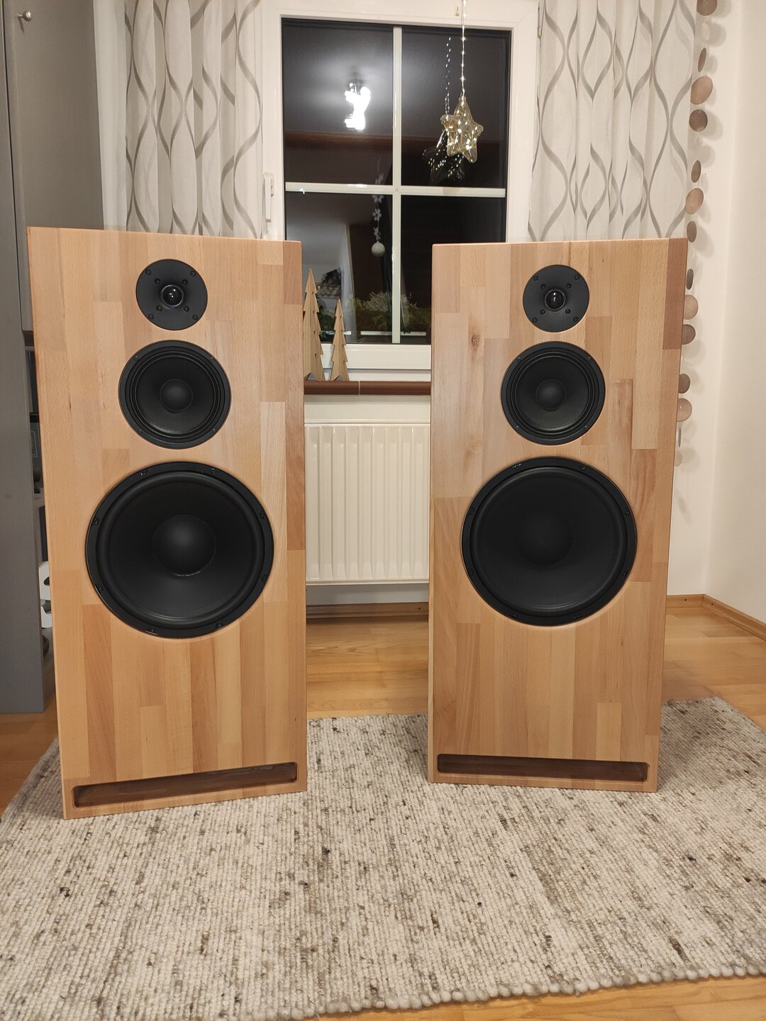 Die Lautsprecher sind kurz vor Weihnachten fertig geworden und mittlerweile beim Auftraggeber. Ich bin mit dem Ergebnis sehr zufrieden, und auch der Auftraggeber ist begeistert. Wenn ich mal eine größere Wohnung mit genug Platz neben dem Fernseher habe, werde ich mir auch ein Paar bauen. Sowohl Musik als auch Filme waren beim Probehören genial. Die finale Effizienz ist 91dB bei 2.83V 1m, hier ist der Hochtöner der limitierende Faktor. Der Tieftöner und der Mitteltöner sollten die 400W RMS problemlos mitmachen, der Hochtöner wahrscheinlich nicht :mrgreen: . Die F3 liegt bei ca 41hz.