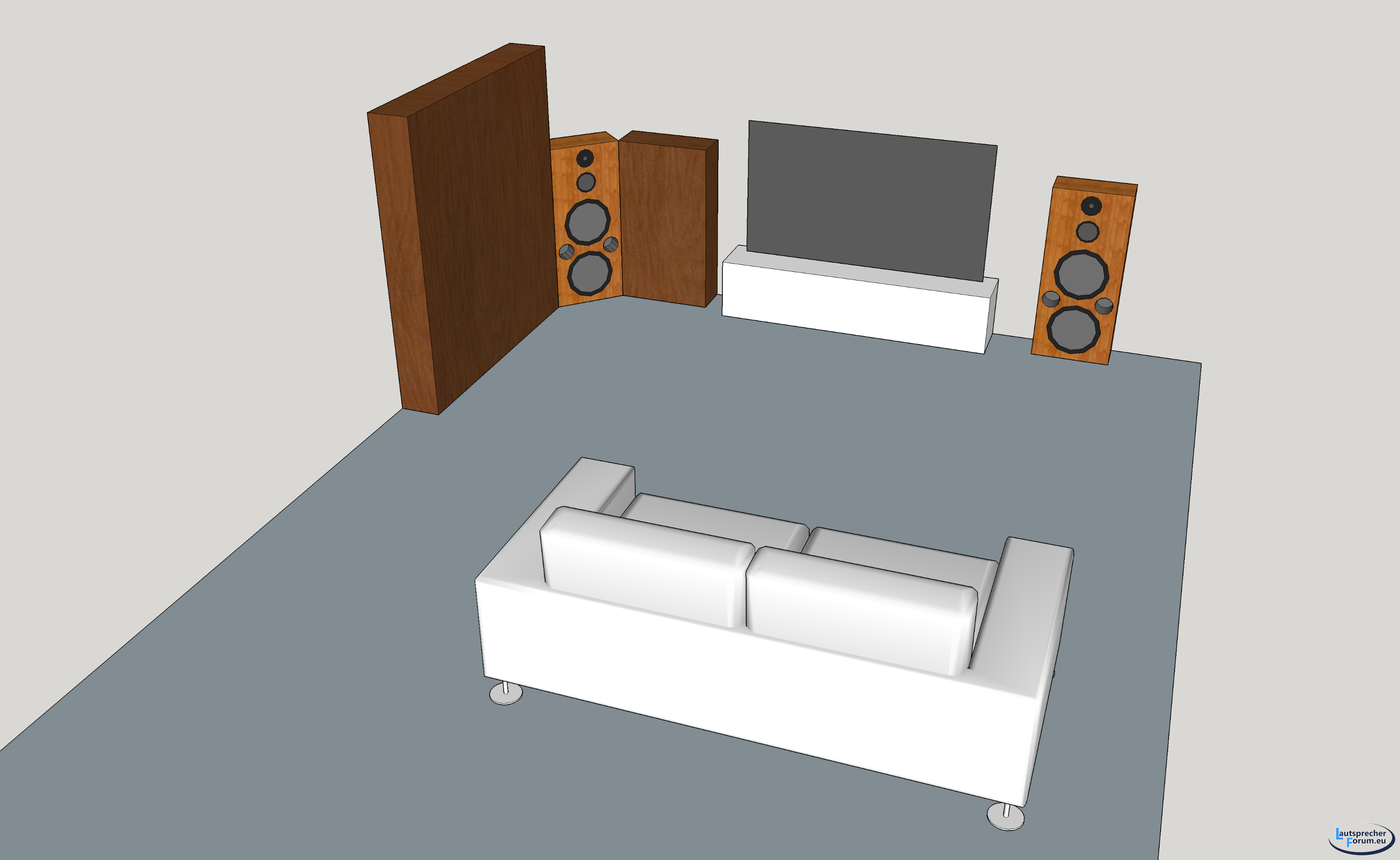 Hier ein Bild von der Situation im Raum. Der eine Ls steht frei an der Wand neben dem Fernseher, und der andere eingebaut zwischen einem halbhohen und einem großen Schrank. Die Schränke sind beide mit Türen, also geschlossen.
