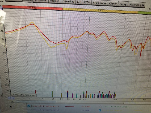 Bild 1 Frequenzgang am Abhörplatz: gelb ohne AVAA‘s und rot mit AVAA‘s Bild 2 Wasserfall ohne AVAA‘s Bild 3 Wasserfall mit AVAA‘s Bild 4 Spectogramm mit AVAA‘s Bild 5 Spectogramm ohne AVAA‘s Alle Messungen natürlich noch ohne FIR Filter Eingriff!